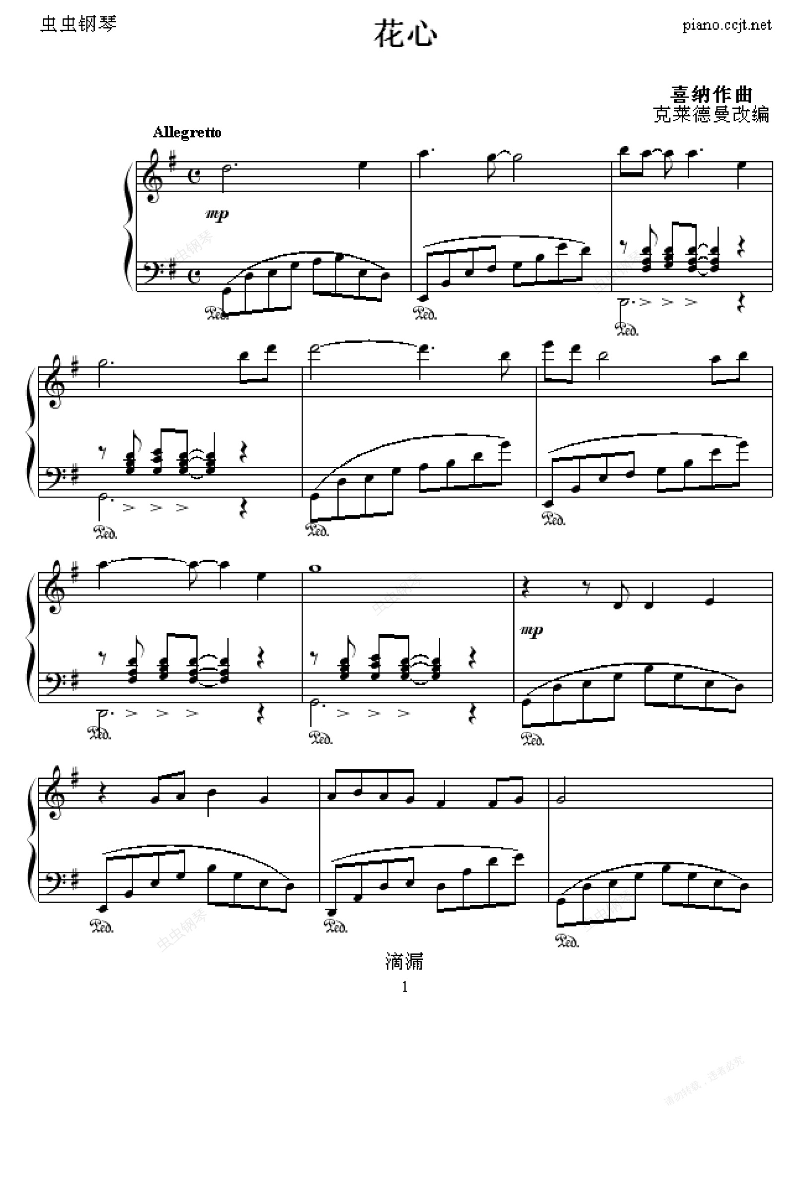 带有克莱德曼风格的《花心》,别有一番风味。G Em C D G 花的心藏在蕊中 空把花期都错过 G Em C D 你的心忘了季节 从不轻易让人懂 G Em C D 為何不牵我的手 共听日月唱首歌 G D 黑夜又白昼 黑夜又白昼 C D G 人生悲欢有几何 G Em C D 春去春会来 花谢花会再开 G D 只要你愿意 只要你愿意 C D G 让梦划向你心海 G Em C D 春去春会来 花谢花会再开 G D 只要你愿意 只要你愿意 C D G 让梦划向你心海 G Em C D G 花瓣泪飘落风中 虽有悲意也从容 G Em C D 你的泪晶莹剔透 心中一定还有梦 G Em C D 為何不牵我的手 同看海天成一色 G D C D G 潮起又潮落 潮起又潮落 送走人间许多愁