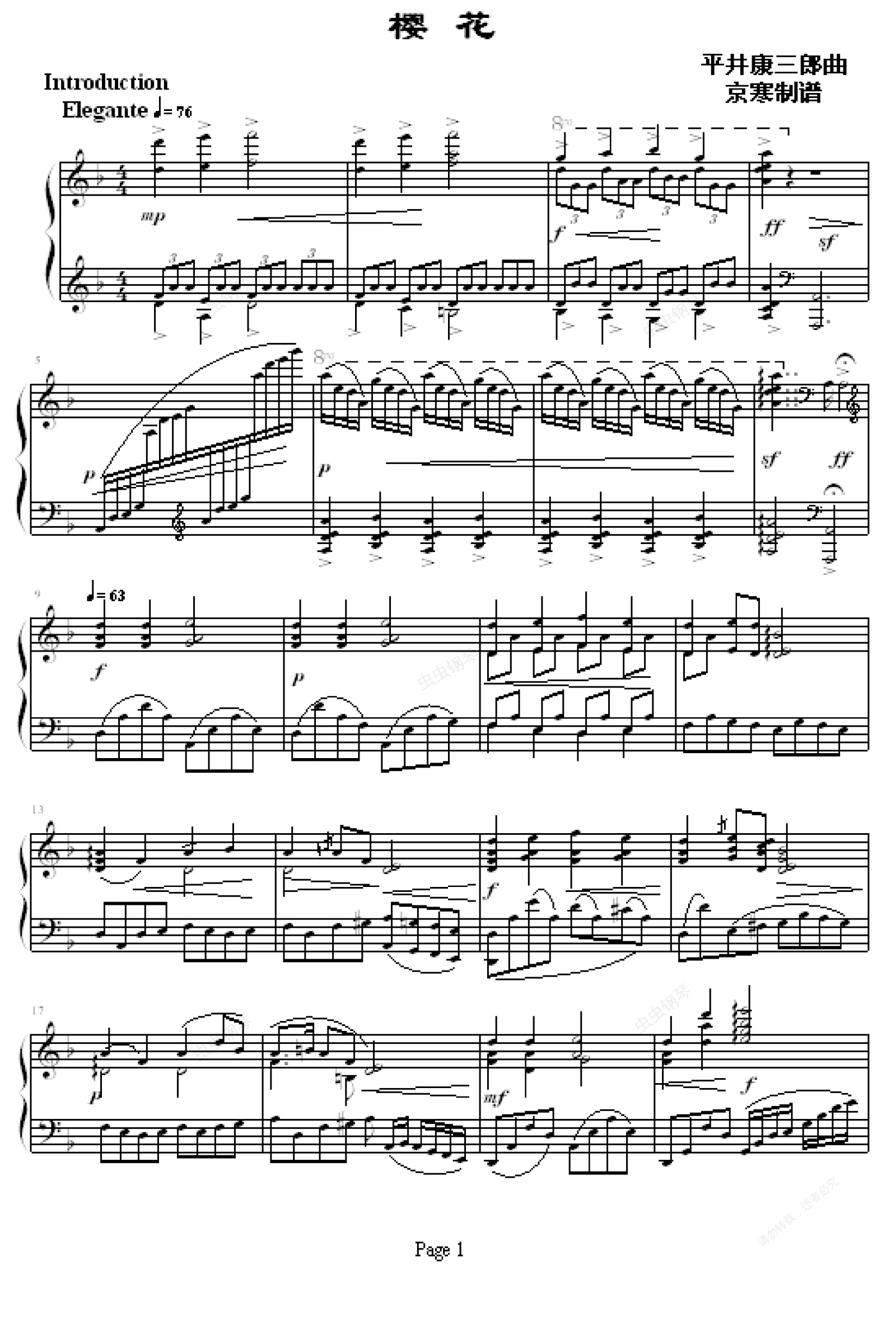 平井康三郎,日本作曲家,创作以声乐著称,器乐曲常以日本民歌为主题。《樱花》根据同名日本民歌改编而成,是其钢琴代表作之一。全曲用变奏手法使音乐逐步发展,具有幻想曲的风格;民歌中赠四度与下行大三度音程的运用使其富有浓郁的日本民歌风味。此谱颇为难找,故希望大家珍惜,由于本人也从未听过本曲的演奏录音,只能参照手中的谱子所标记的表情记号等,结合自己弹奏时的感觉制成此谱,效果处理不合适的地方希望高手提出宝贵意见。