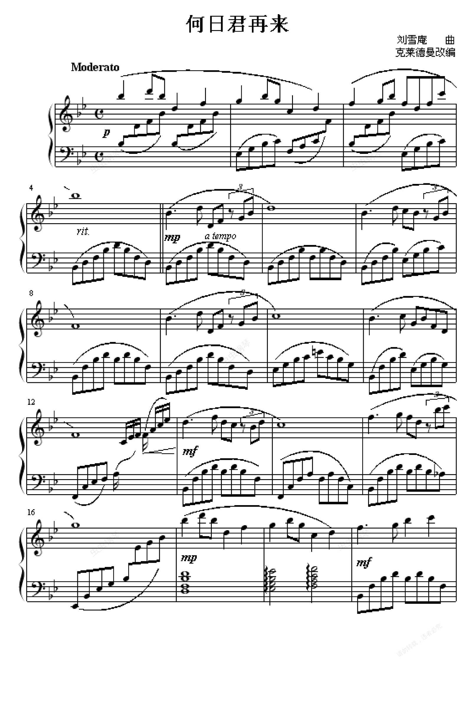钢琴谱:何日君再来