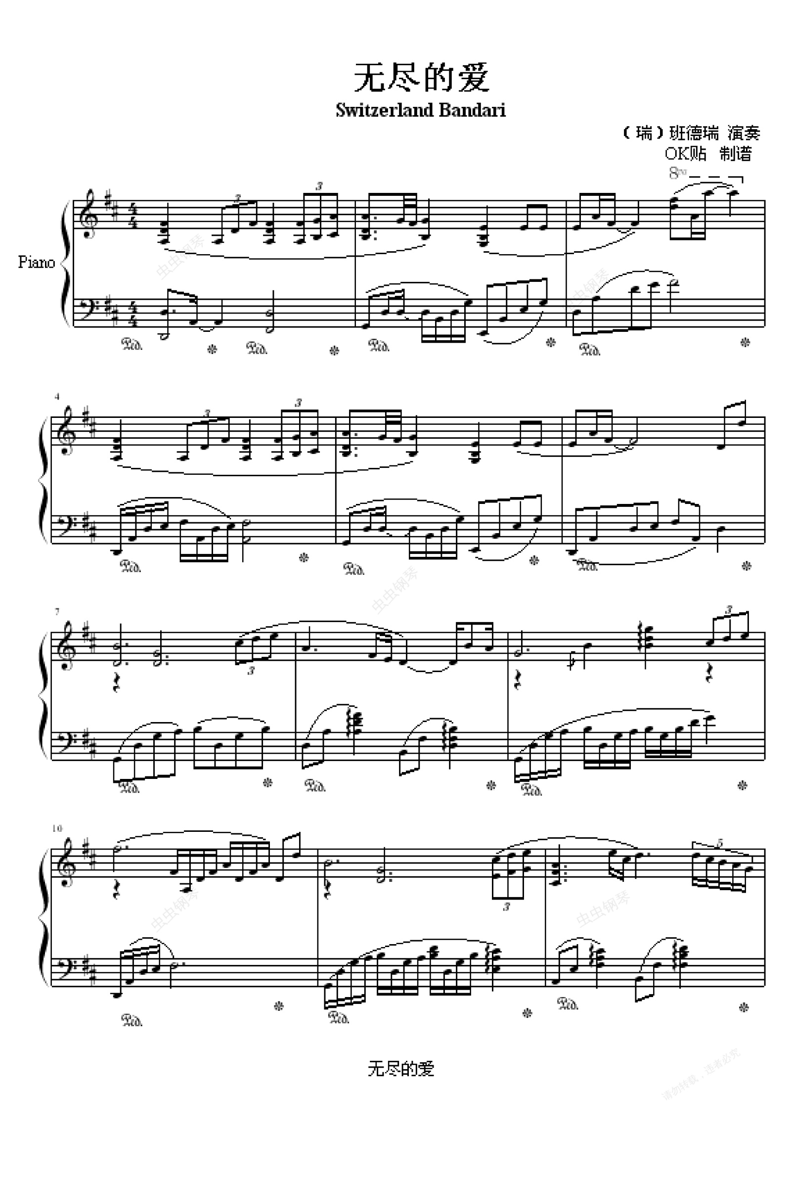 普遍而令人喜悦的爱,就是不朽。                                ——劳伦斯    永恒,无限,就是爱的终点,还有什么比爱更永恒呢?爱是有目的的旅程。爱不是目的,只是旅程。而这种永无休止的旅程,渗透在我们正在行走的路上。同样,陪伴着我们的一切都有爱的存在,爱是无尽的。        这首《无尽的爱》由班德瑞乐队演奏,更让人感到一中毫无缺憾的温馨,特意制作成钢琴谱给大家欣赏。 注:这首曲可是我最喜欢的,是辛苦了很久才制出来的,请支持。