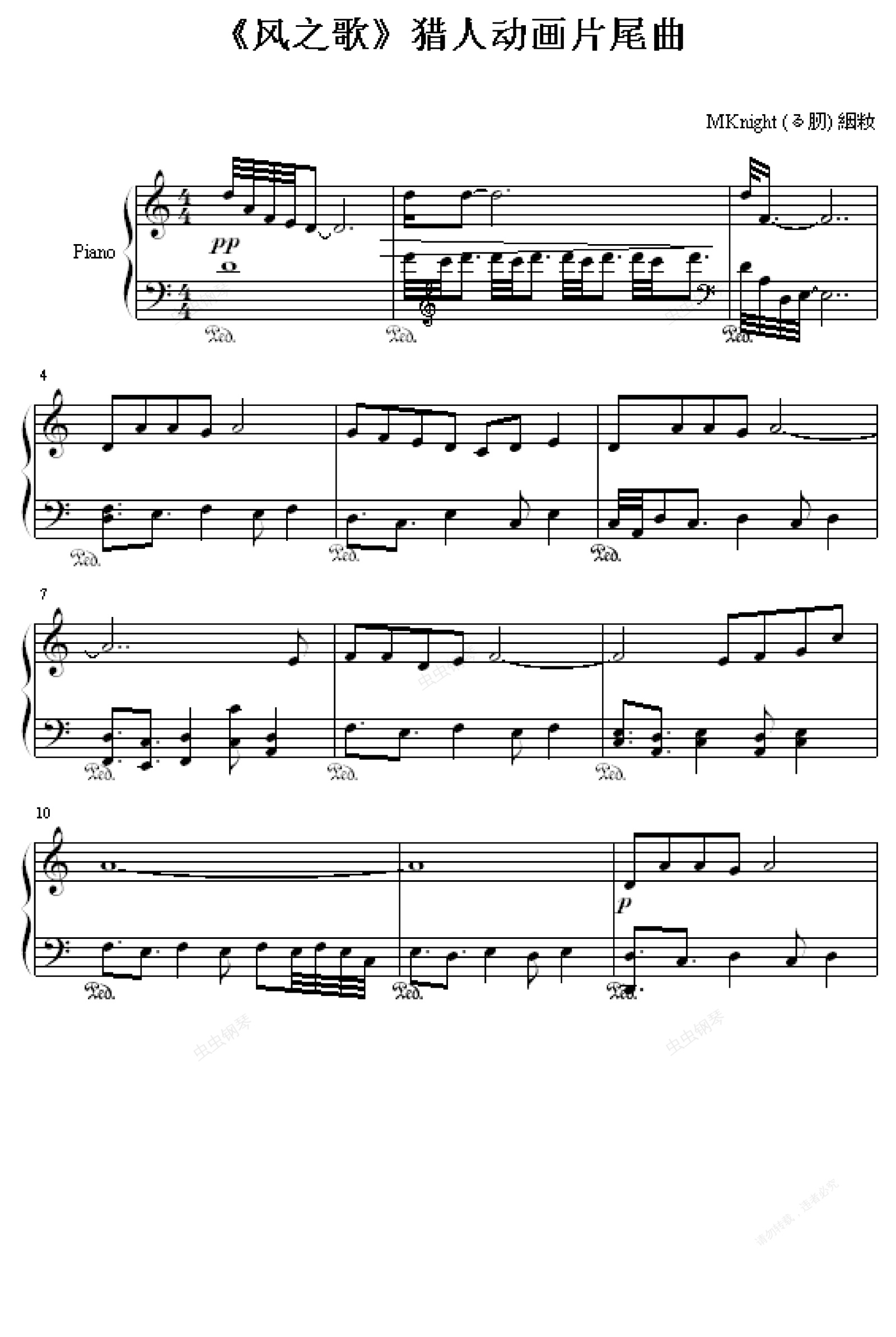 钢琴谱:风之歌 - 猎人动画片尾曲