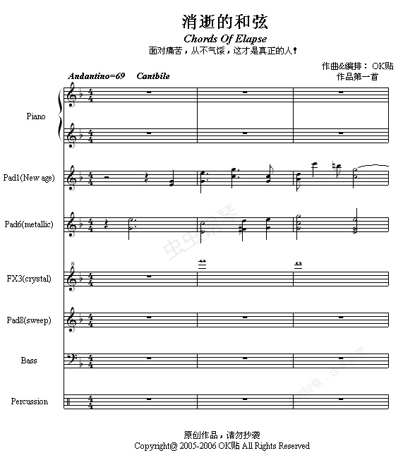 《消逝的和弦》这曲原名《C'est La Vie》,在和伦一起的童年时,我俩曾说过要面对困难不畏惧,所以这首曲就有一段很激昂的旋律。另外,有一段旋律出现了四次,这是具有回忆色彩的旋律,也是我自己非常喜欢的。这并非一首悲伤的曲,我当时的创作意图是想告诉伦我们都要坚强地生活,所以把旋律写得积极向上。我特意将这首曲编排成全谱形式,是为了像流行曲,因为伦说喜欢流行曲。这首曲是我非常用心作的曲,只可惜最终他还是没听到……大家请欣赏一下吧,请您们祝福伦在另一世界生活得快乐吧,也请大家要学会坚强和微笑面对生活,因为世界还有很多美好的东西值得我们去发现、珍惜。