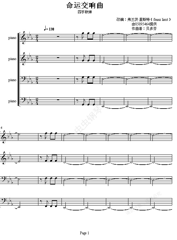 钢琴谱:命运交响曲 -(钢琴4手联弹)