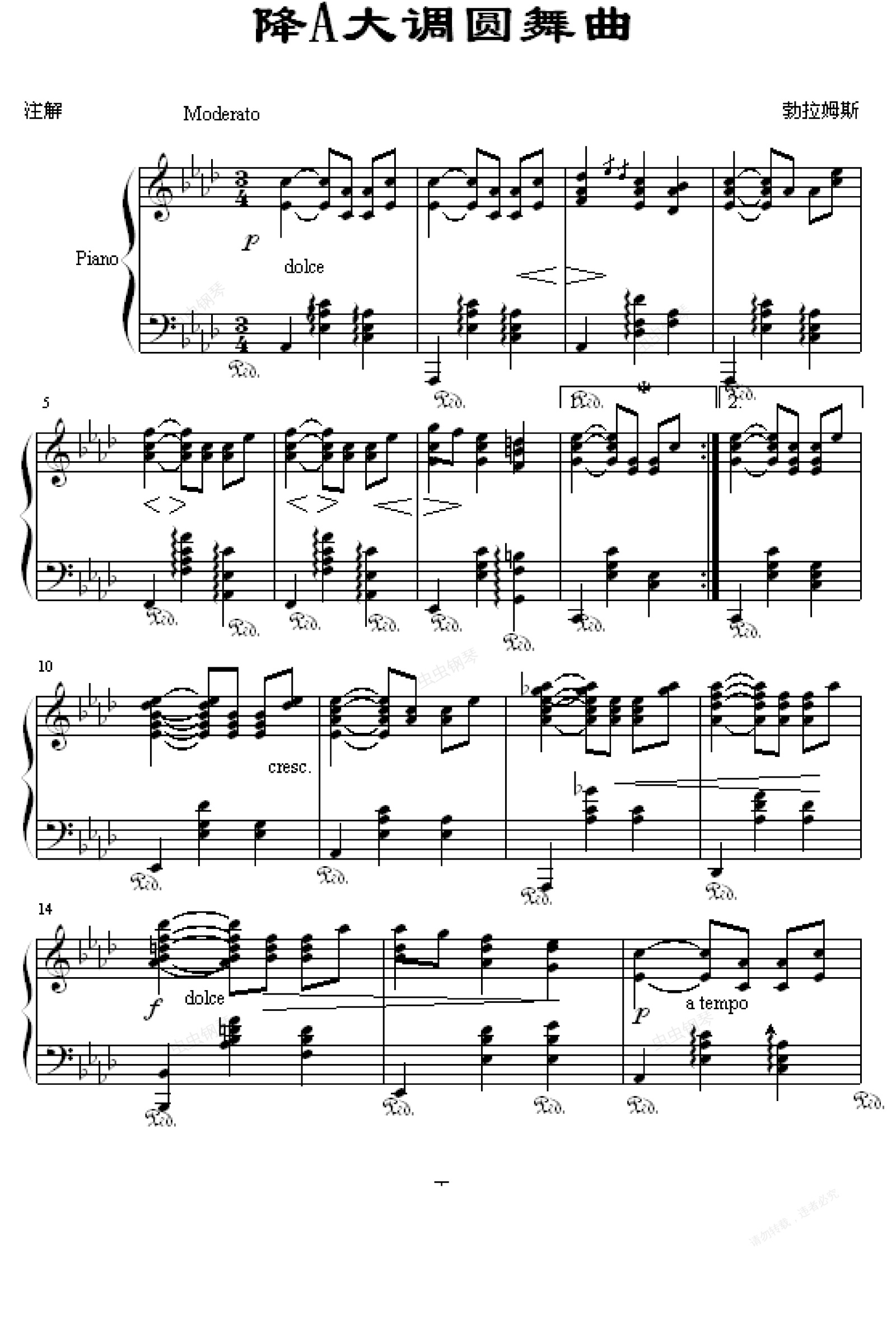 "勃拉姆斯(1833-1897)的圆舞曲,和贝多芬的圆舞曲一样,是从古老的德国农民舞曲那里吸取灵感的,要用直接了当的方式弹奏,情绪单纯 坦率 真诚.小心避免任何微妙或精致的表情,把这种效果留给象肖邦的圆舞曲那样的作品."