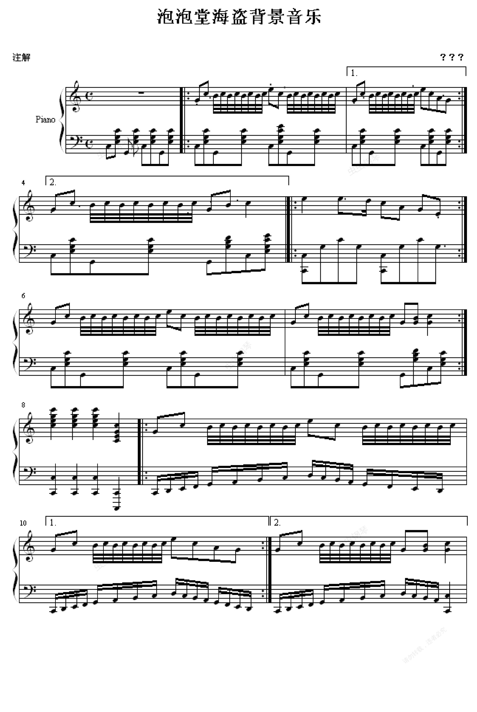 钢琴谱:海盗版游戏音乐 -(改编自泡泡堂)
