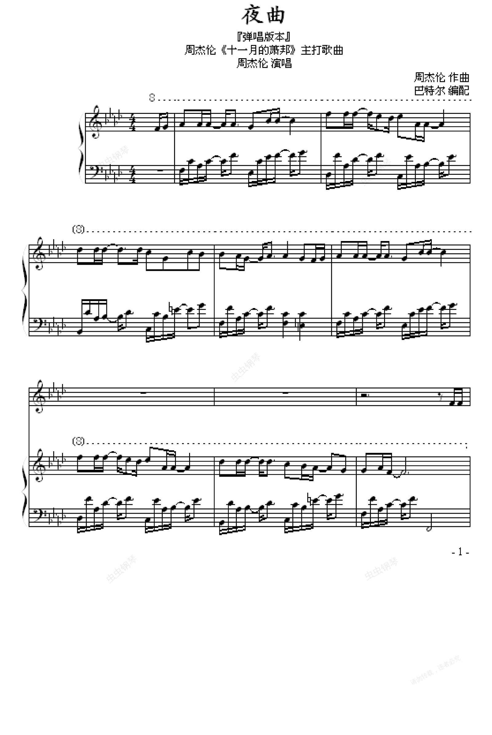 周董最新大碟《11月的萧邦》中的主打歌,也是整首专集的精神所在。描述的是一个很凄美的爱情故事,此曲旋律感人,在本版块中有较多版本,不过距我发现好象只有演奏版,没有弹唱版本,所以我斗胆做了弹唱版本,希望大家能够喜欢!这次,我参照了其他演奏版本,做了一个自我感觉比较接近的《夜曲》,左手的16分音符可能跨度比较大,可以用右手演奏,希望大家喜欢。由于我不太会用最新版本OVE的歌词版块,所以很抱歉没能把歌词打上来~!