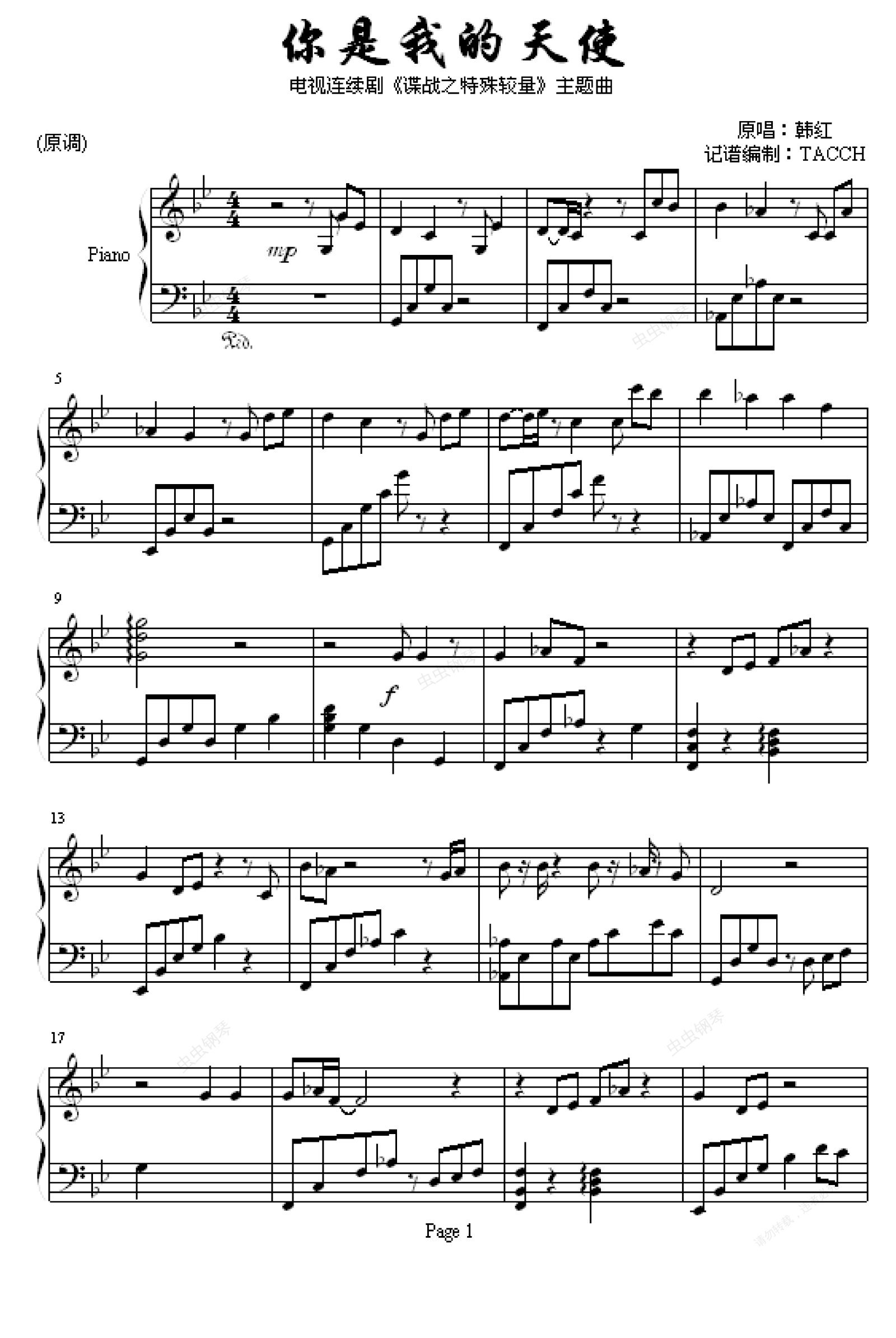 钢琴谱:你是我的天使-电视剧《谍战之特殊较量》主题曲钢琴独奏