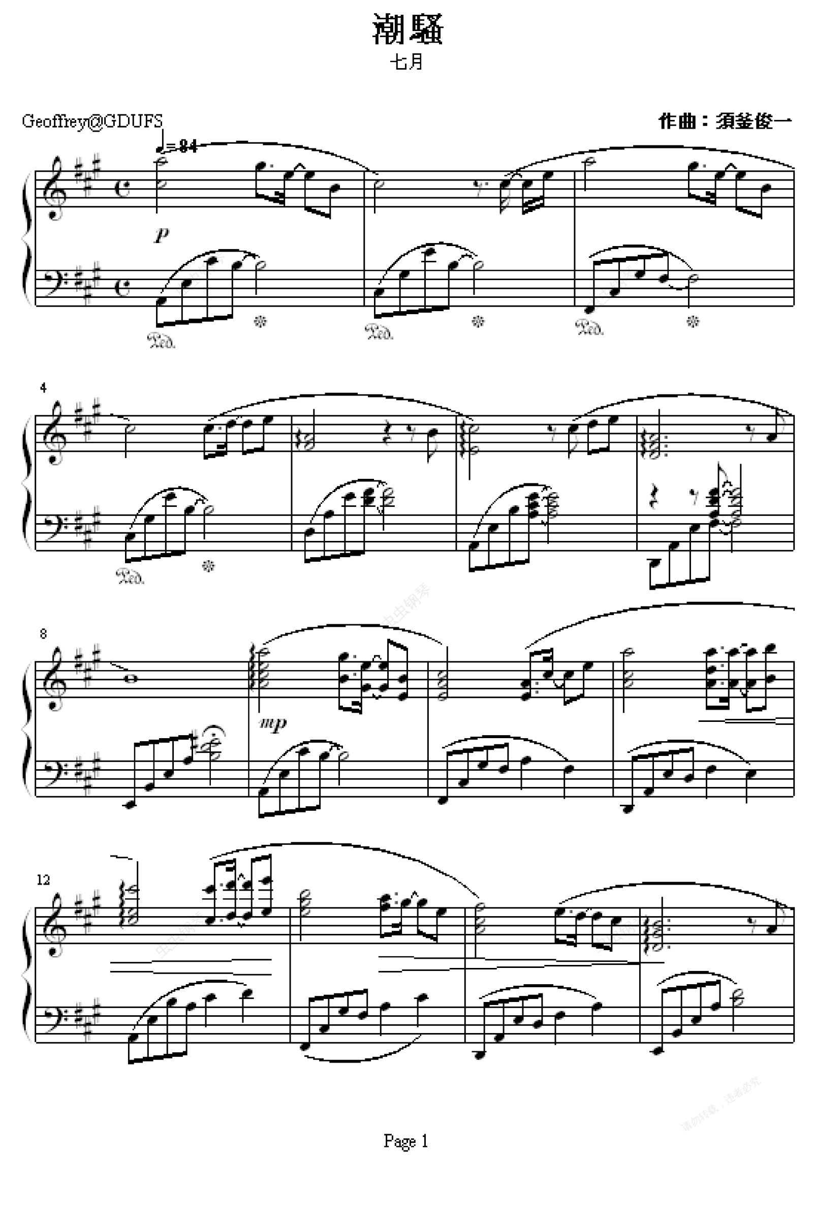 钢琴谱:七月潮水