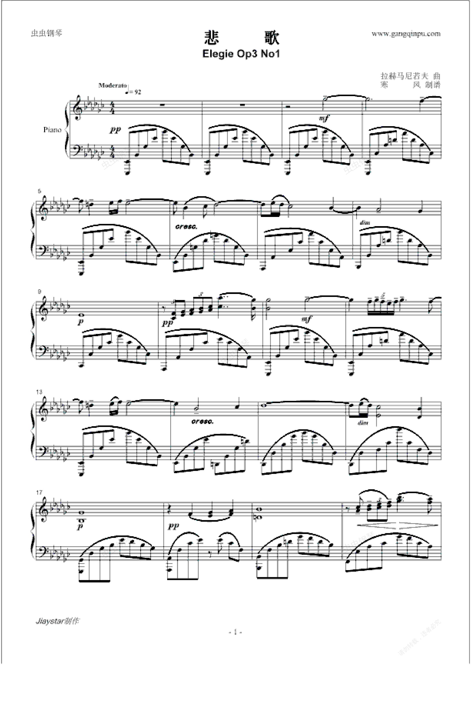 钢琴谱:悲歌-Elegie Op3 No1