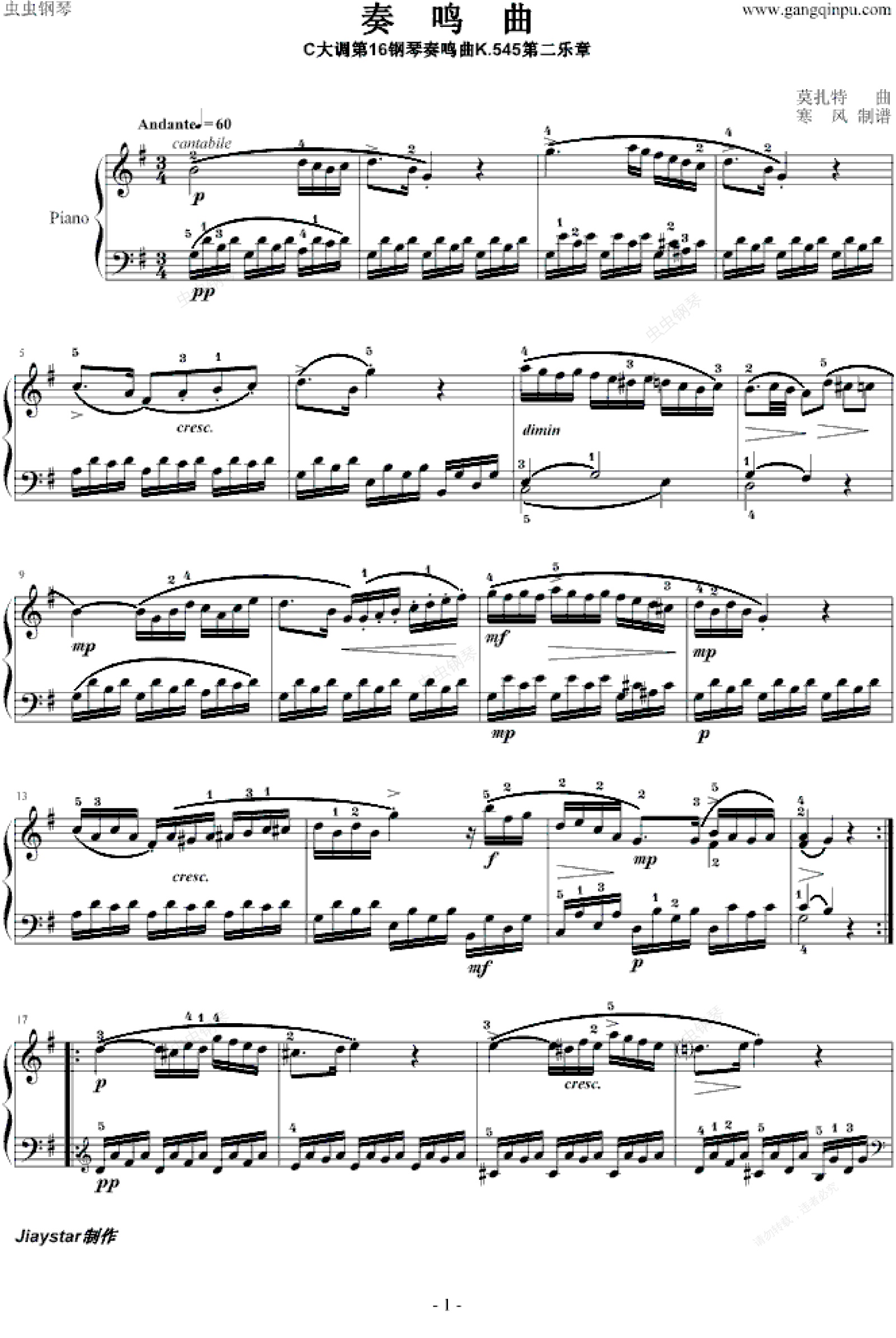 钢琴谱:莫扎特C大调第16钢琴奏鸣曲K.545第二乐章