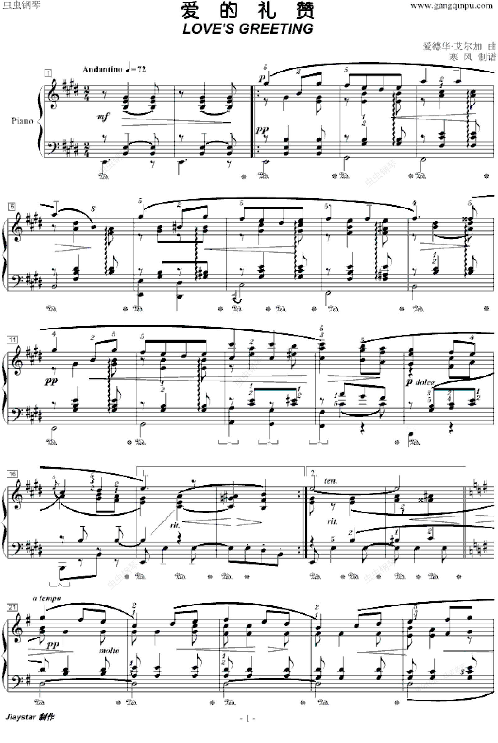 《爱的礼赞》亦译作《爱的问候》及《情人的问候》,是艾尔加献给妻子爱丽丝的求婚曲,原名“”(Love's)。本曲具有典型的“小夜曲”风格,轻松而典雅,是极适用于舞会和沙龙等场合的音乐。 乐曲为典型的ABA三段体加一个尾声构成。A段主题为E大调,小提琴在高音区奏出饱含深情的旋律,恰似来自情人的绵绵情话;乐曲的B段主题转为G大调,柔美的曲调中多了一丝哀怨的情调,经过带有泛音色彩的华丽过门,乐曲又回到A段,经过带有复杂情绪的尾声,全曲在A段主题的变奏形式下逐渐减弱而终了,仿佛是情人还在喃喃私语……
