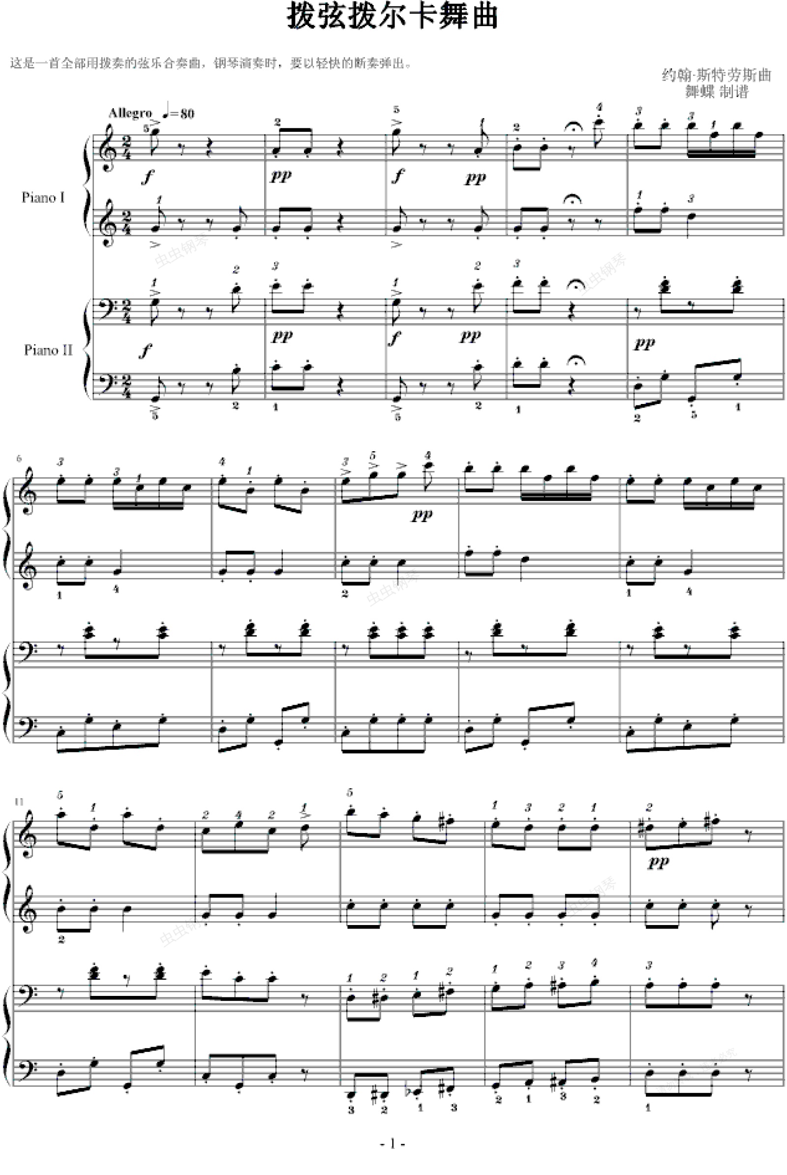 这是一首全部用拨奏的弦乐合奏曲,钢琴演奏时,要以轻快的断奏弹出。