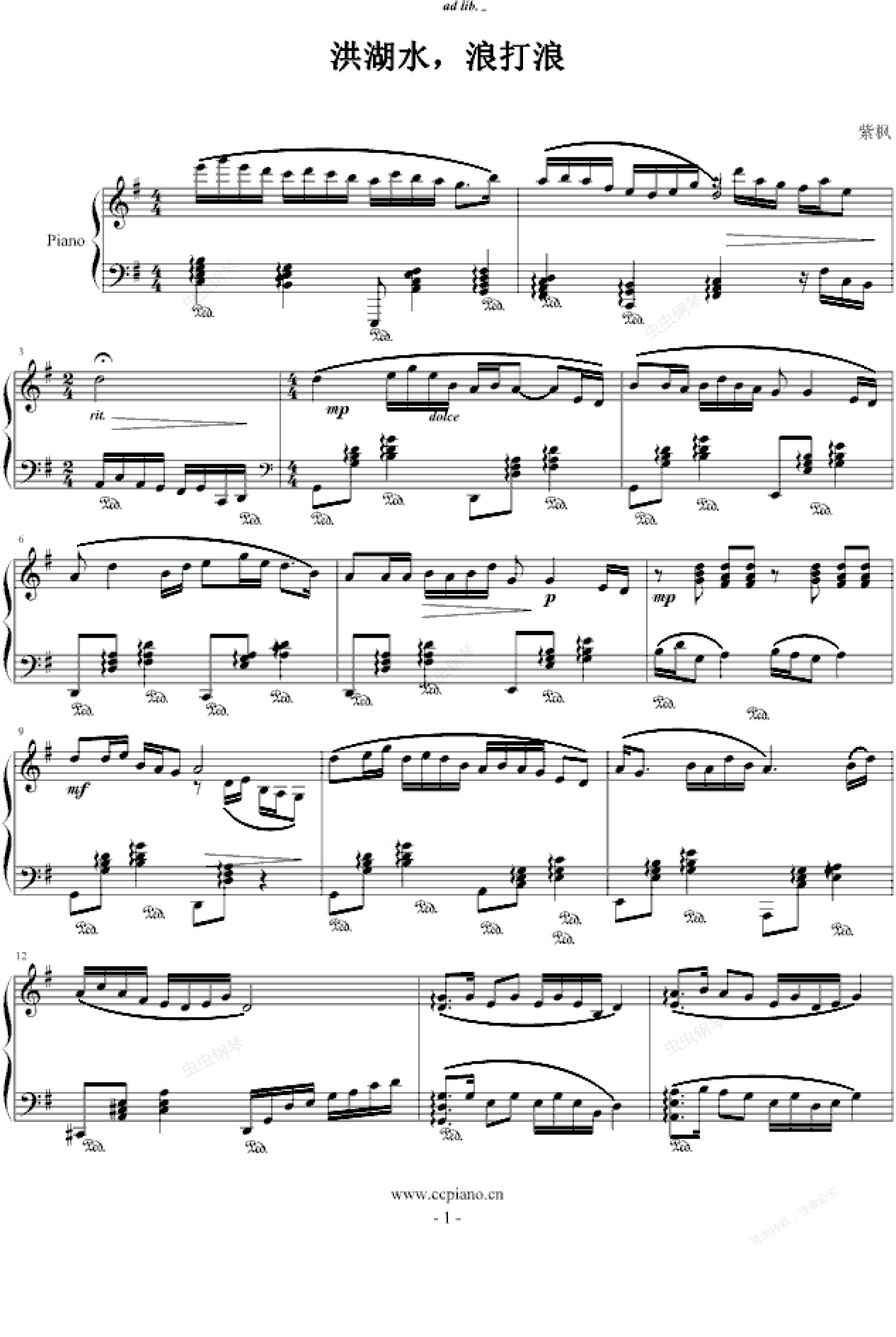 钢琴谱:洪湖水,浪打浪
