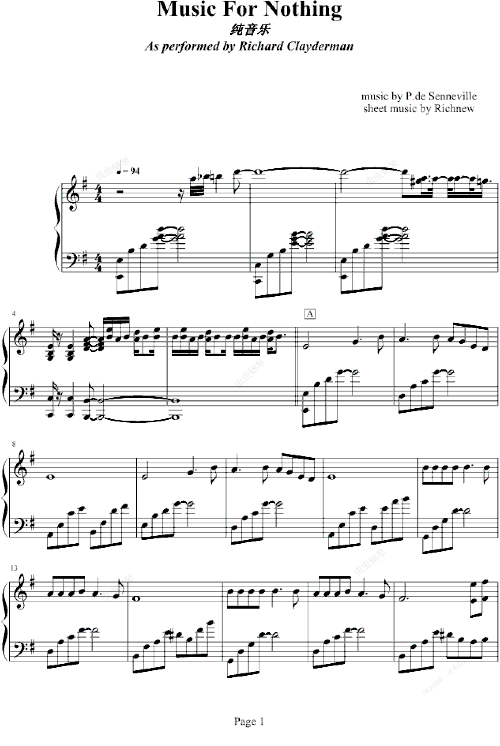 钢琴谱:Music For Nothing