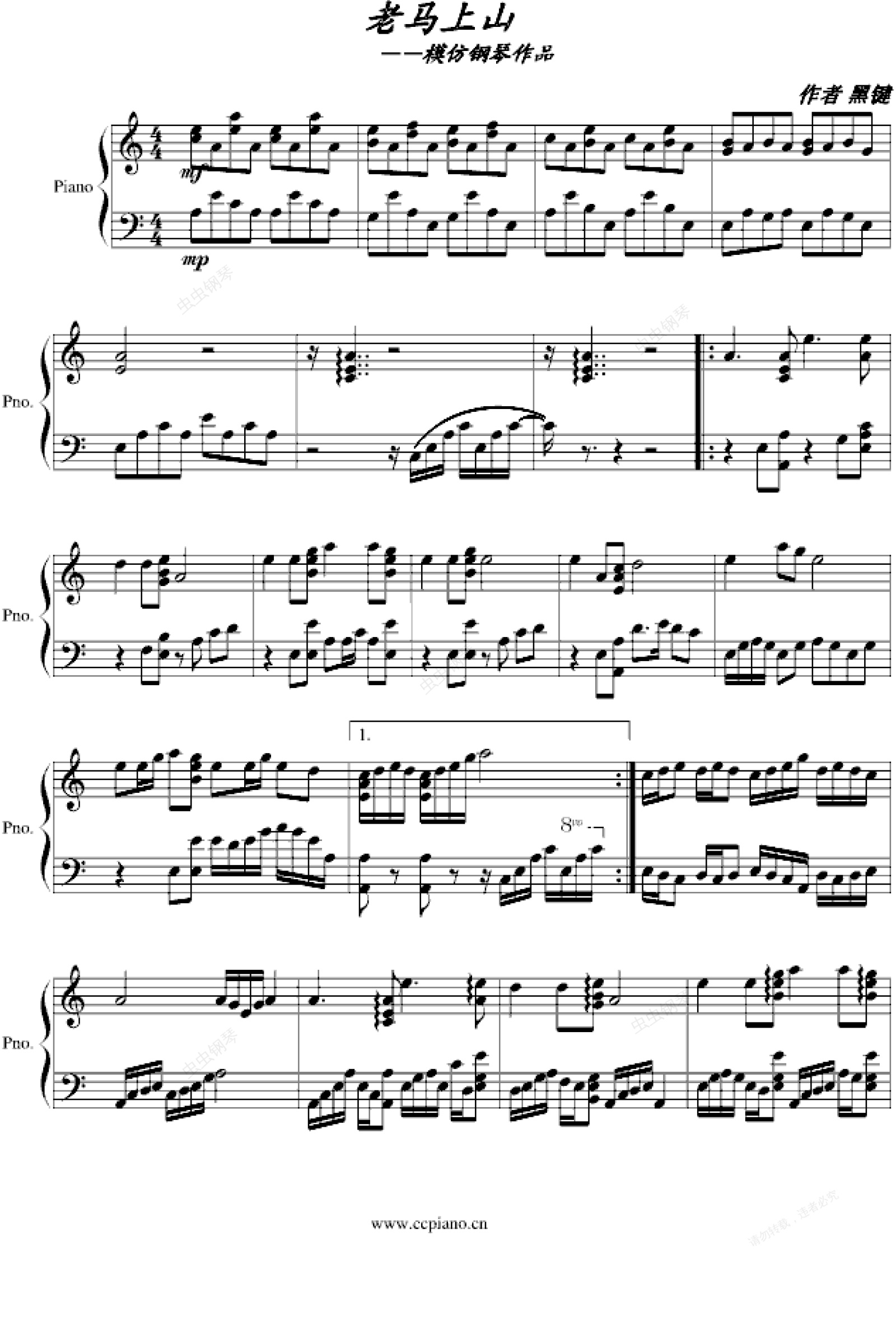 本曲是描写一匹老马负重上山。先是走一段平坦的马路,显得非常的自在。然后就是走一段上坡的青石板小路,显得有点摇摇晃晃。最后终于爬上来山顶,结果高兴过了头。把自己摔下了山。