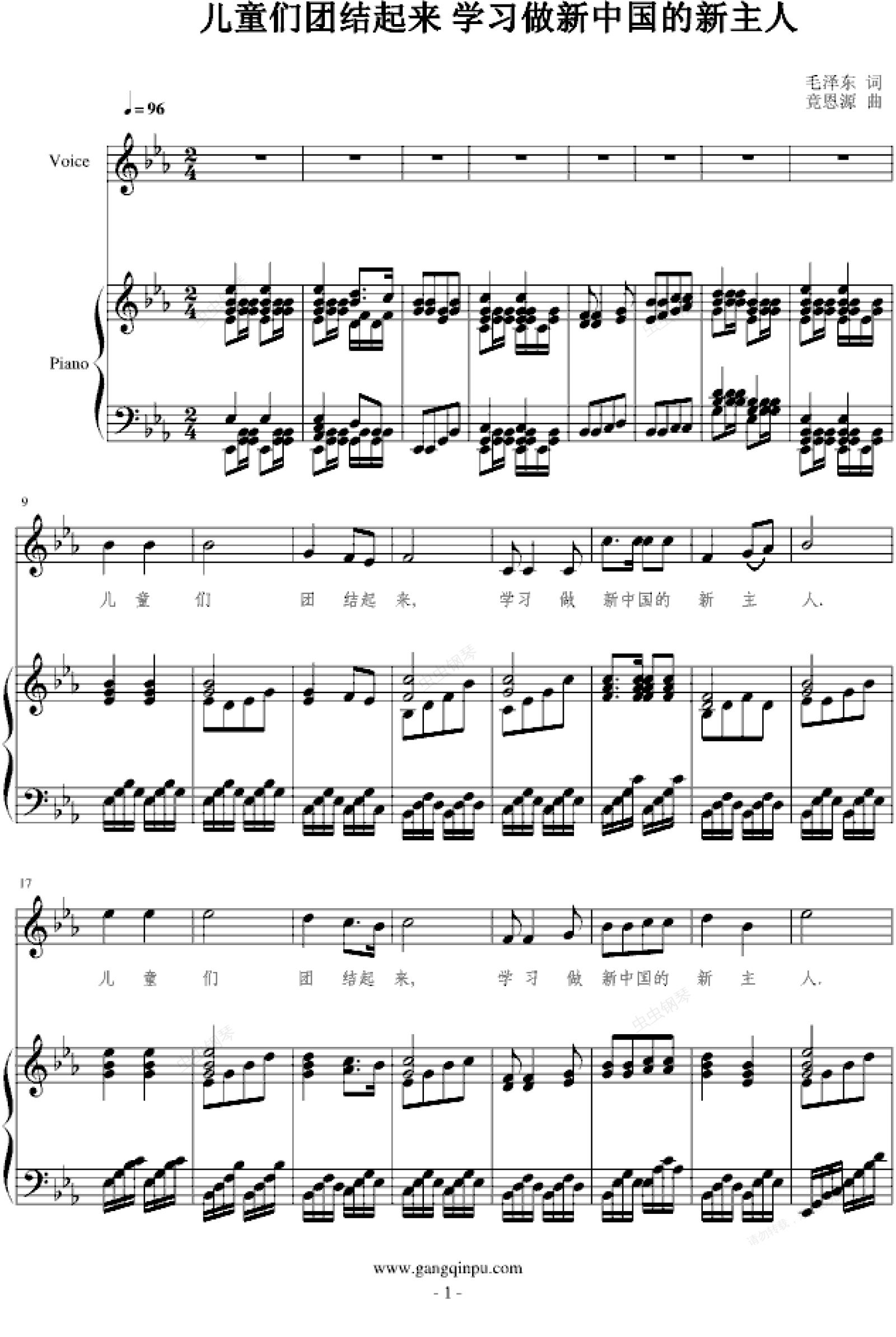钢琴谱:儿童们团结起来 -学习做新中国的新主人-毛泽东词 竟恩源曲