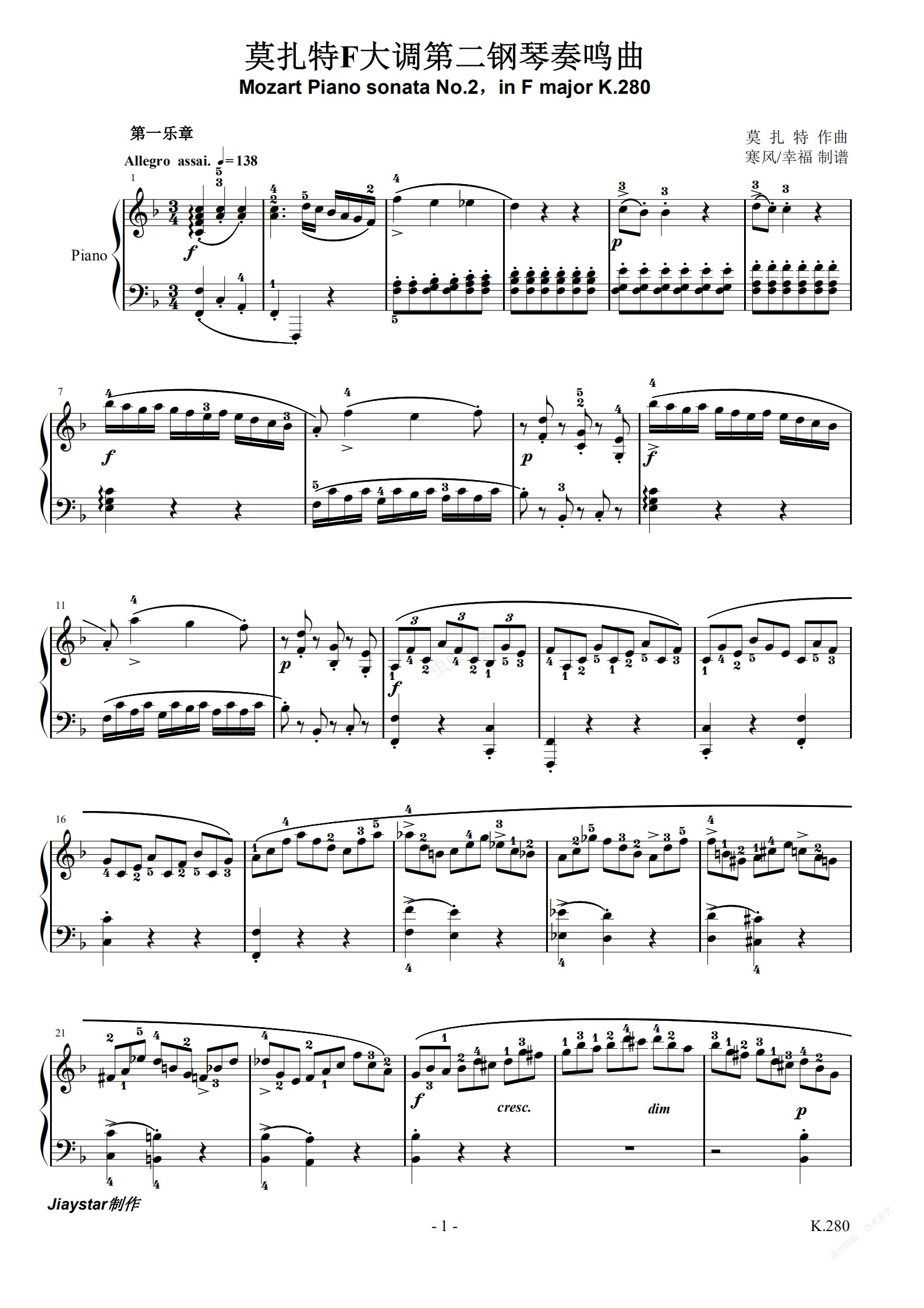 钢琴谱:莫扎特F大调第二钢琴奏鸣曲K.280