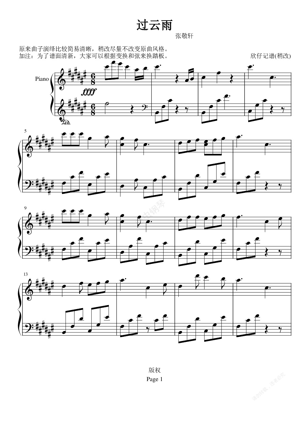 钢琴谱:过云雨-b欣仔b版
