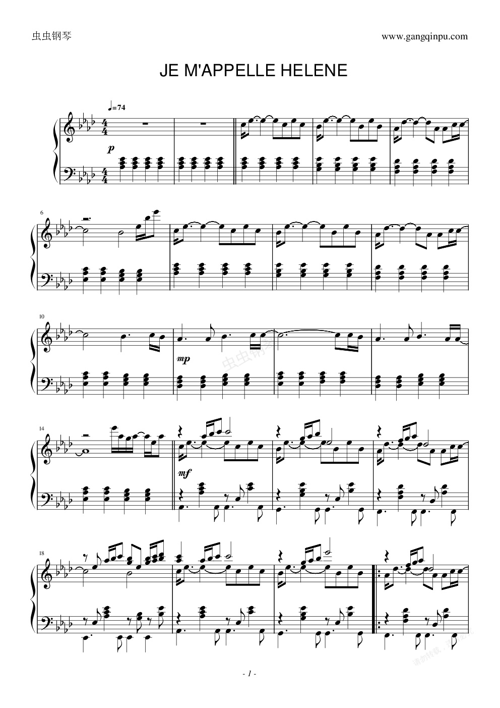 钢琴谱:Je M Appelle Helene