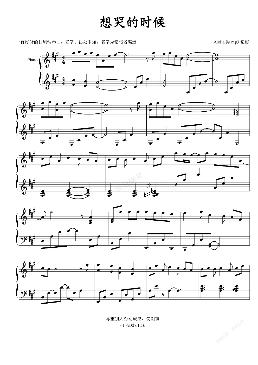 钢琴谱:想哭的时候