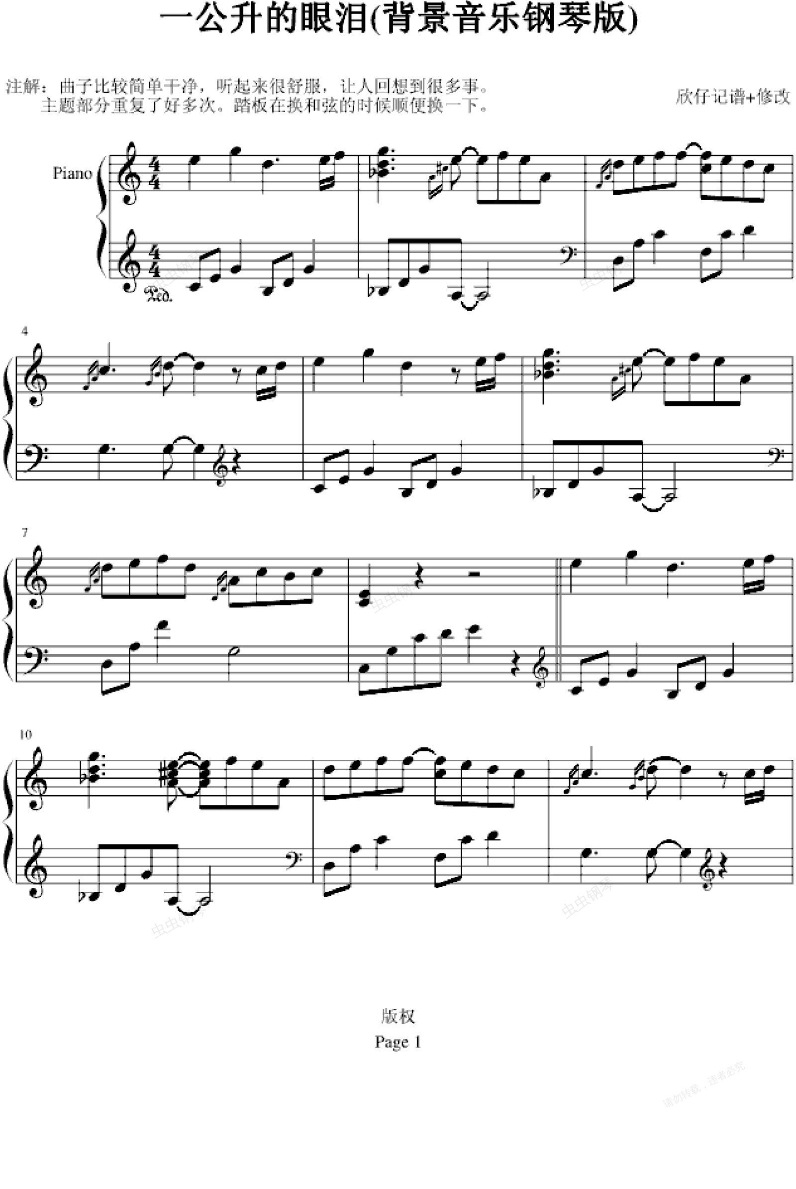 钢琴谱:一公升的眼泪-(背景音乐完整版)