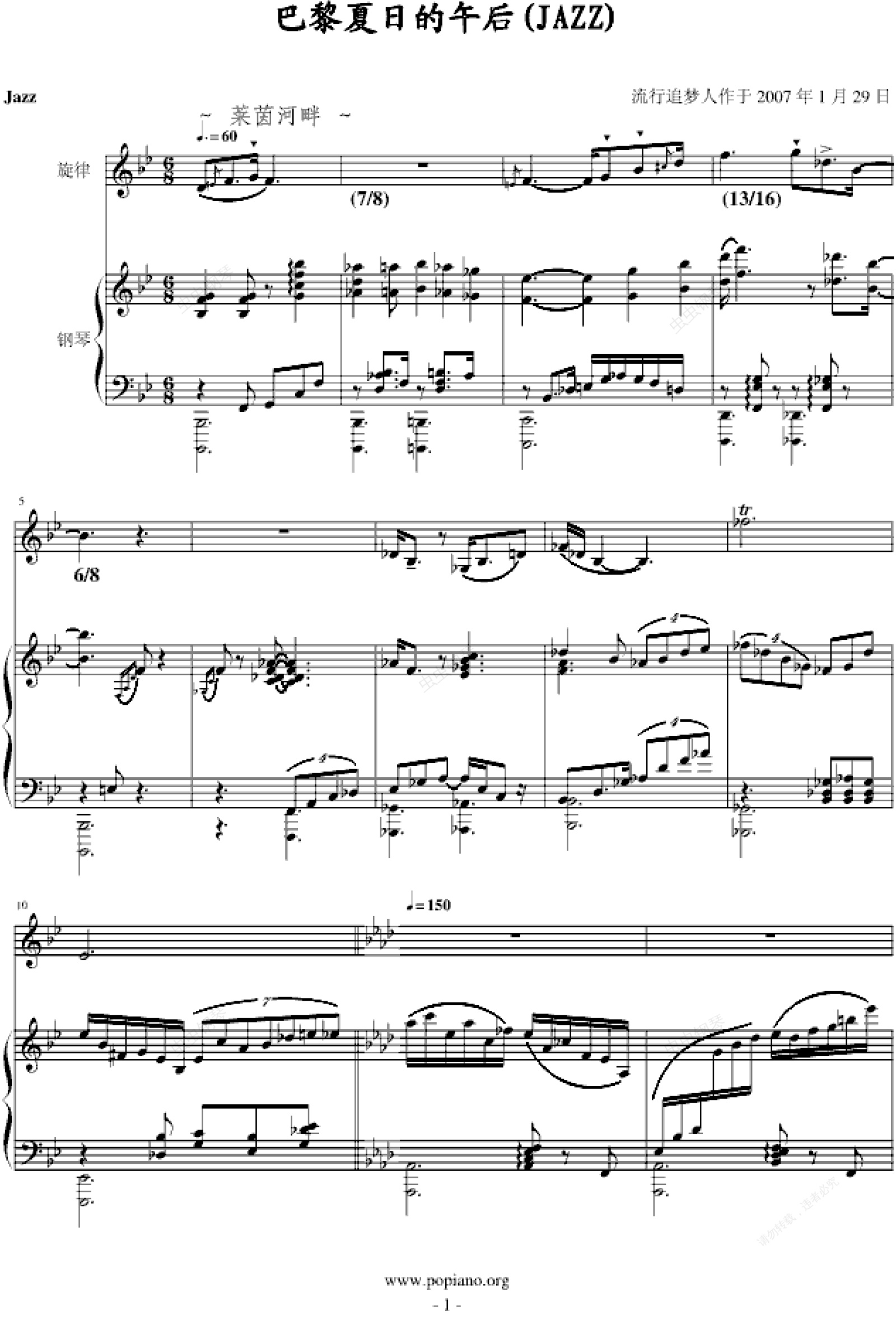 钢琴谱:爵士乐《巴黎夏日的午后》