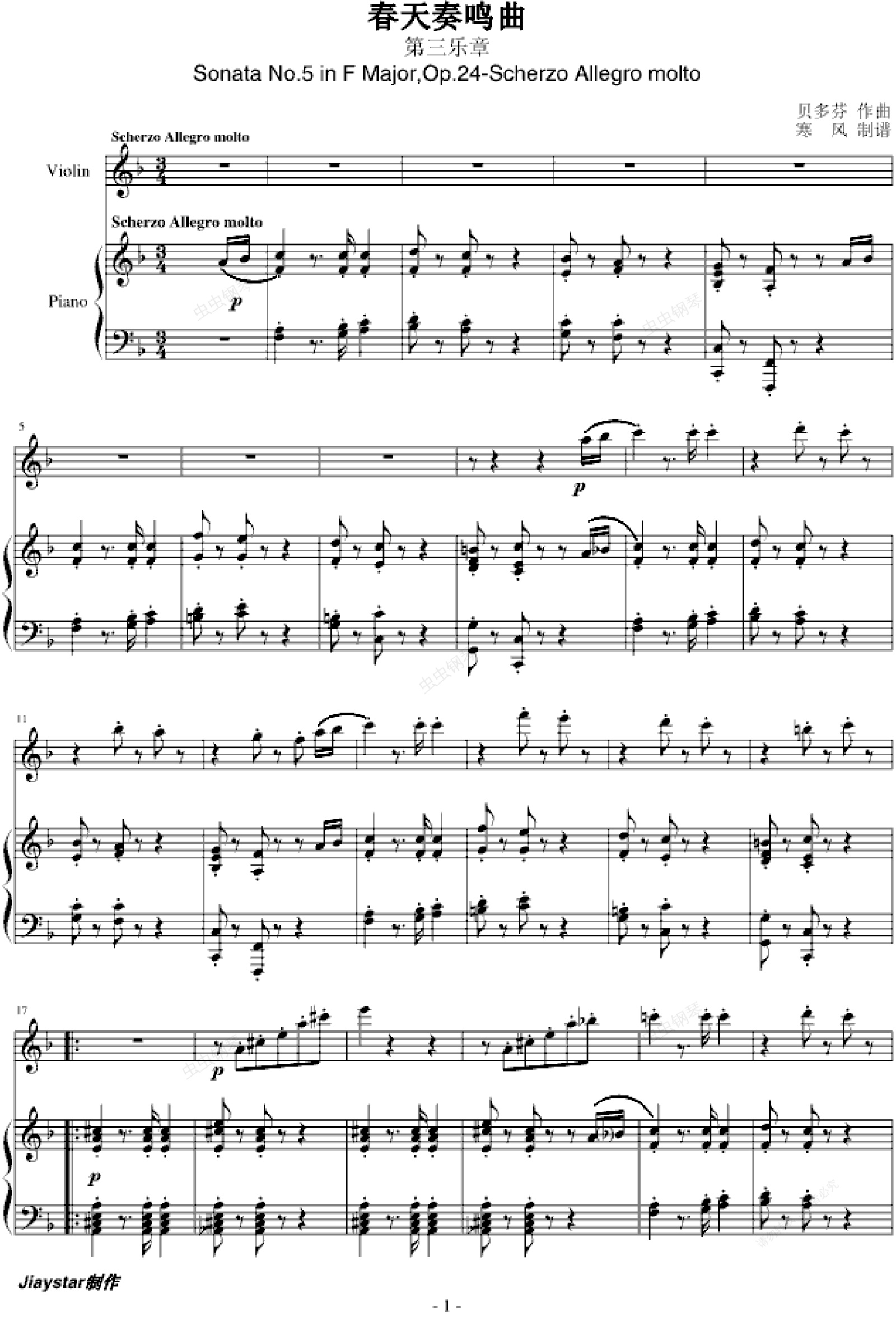 钢琴谱:贝多芬第五小提琴、钢琴奏鸣曲“春天”(Op.24)第三乐章