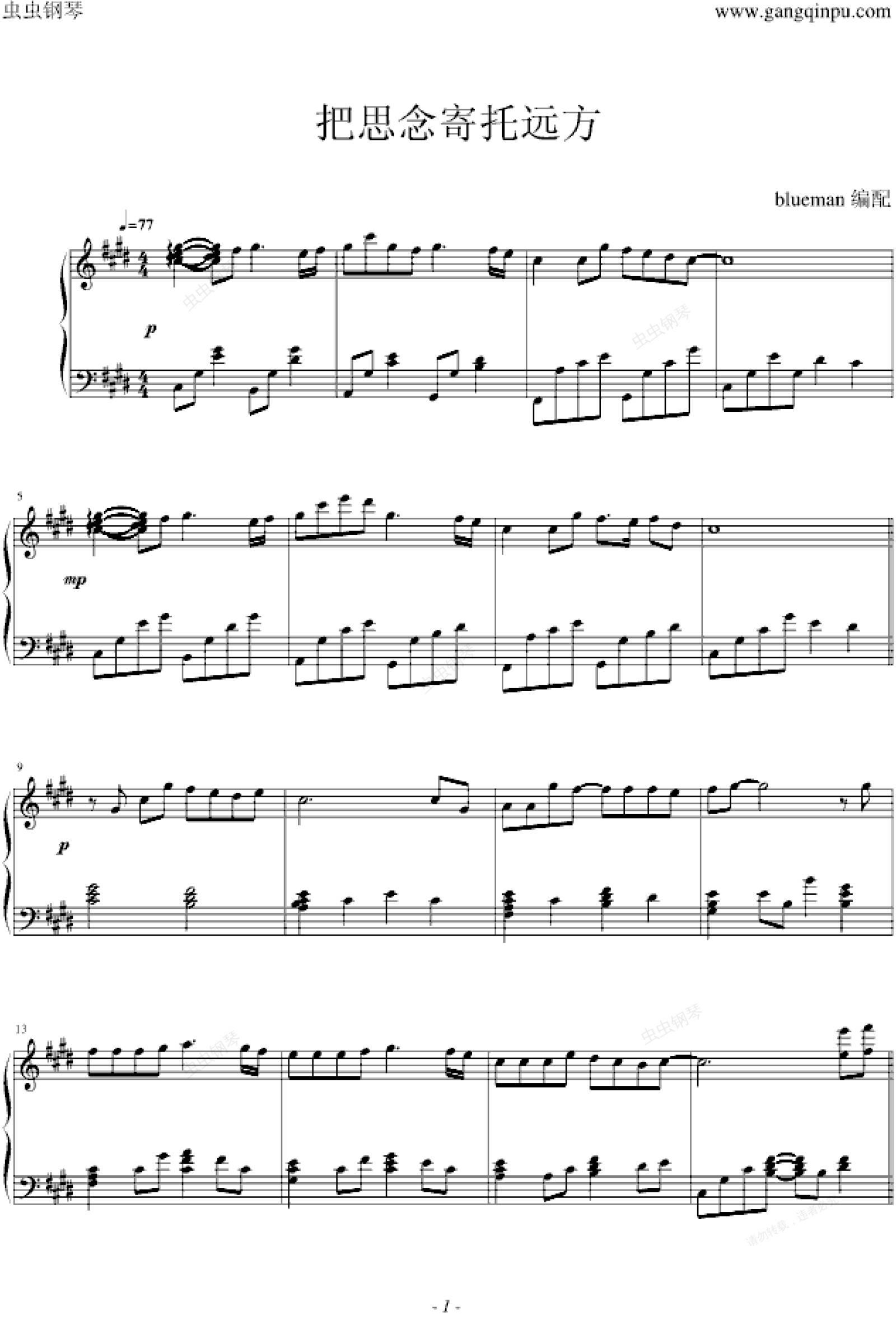 钢琴谱:把思念寄托远方