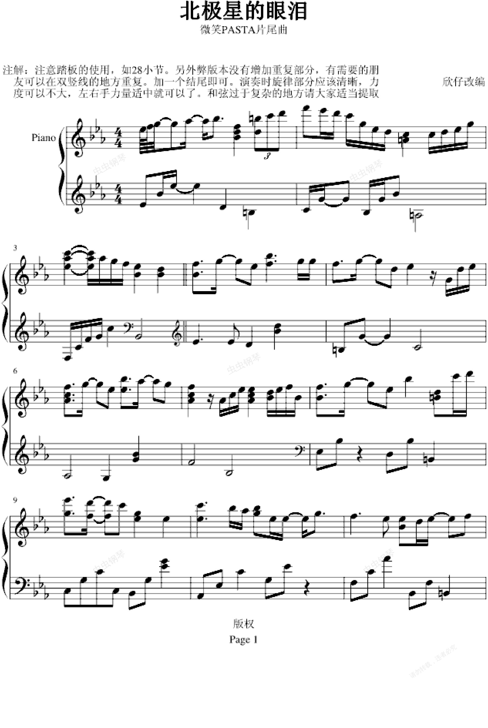 钢琴谱:北极星的眼泪-《微笑PASTA》的主题曲