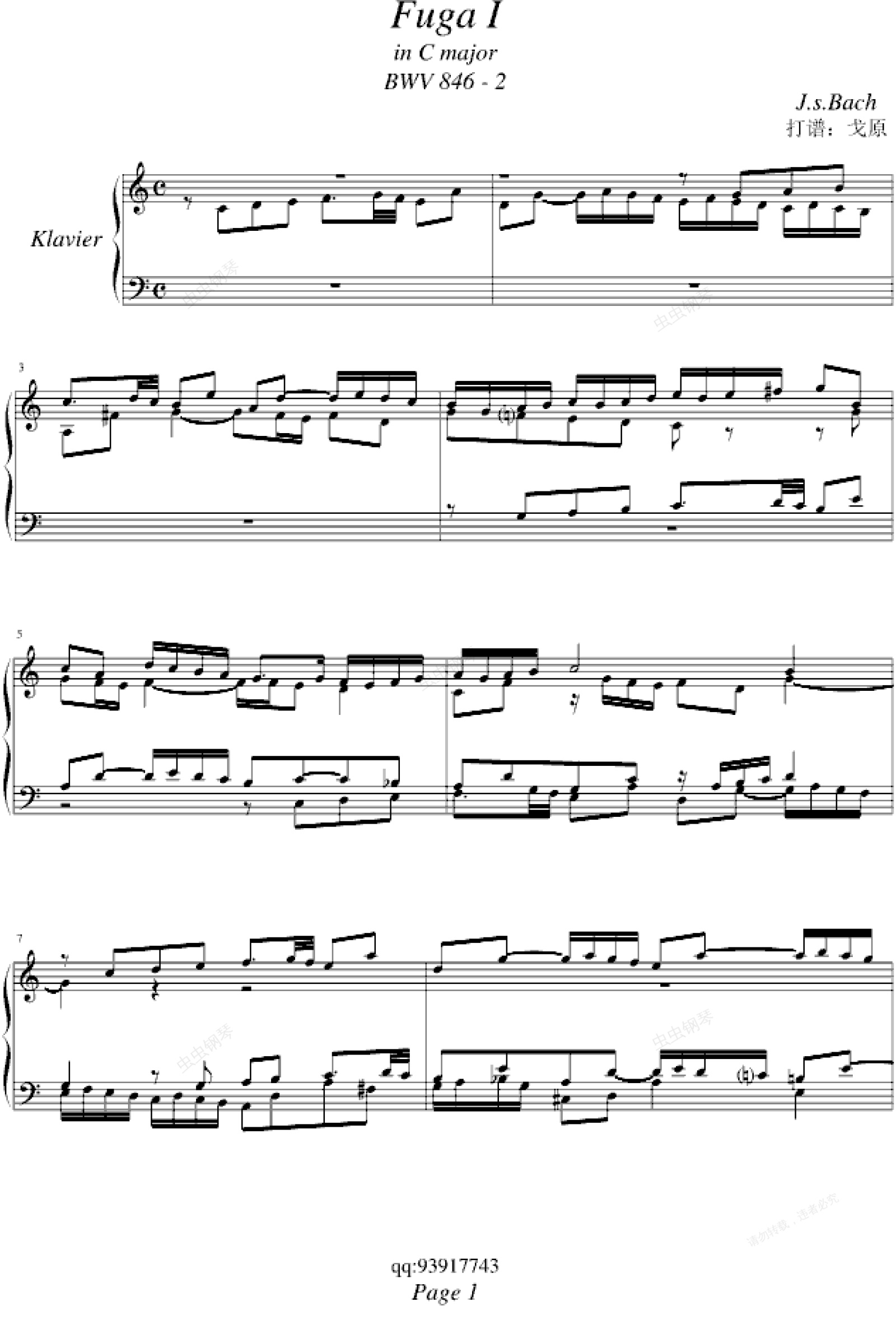 钢琴谱:巴赫Fuga I(BWV 846-2)