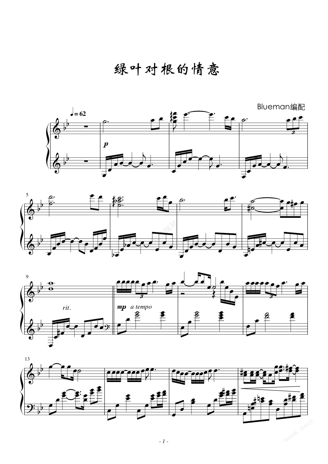 钢琴谱:绿叶对根的情意