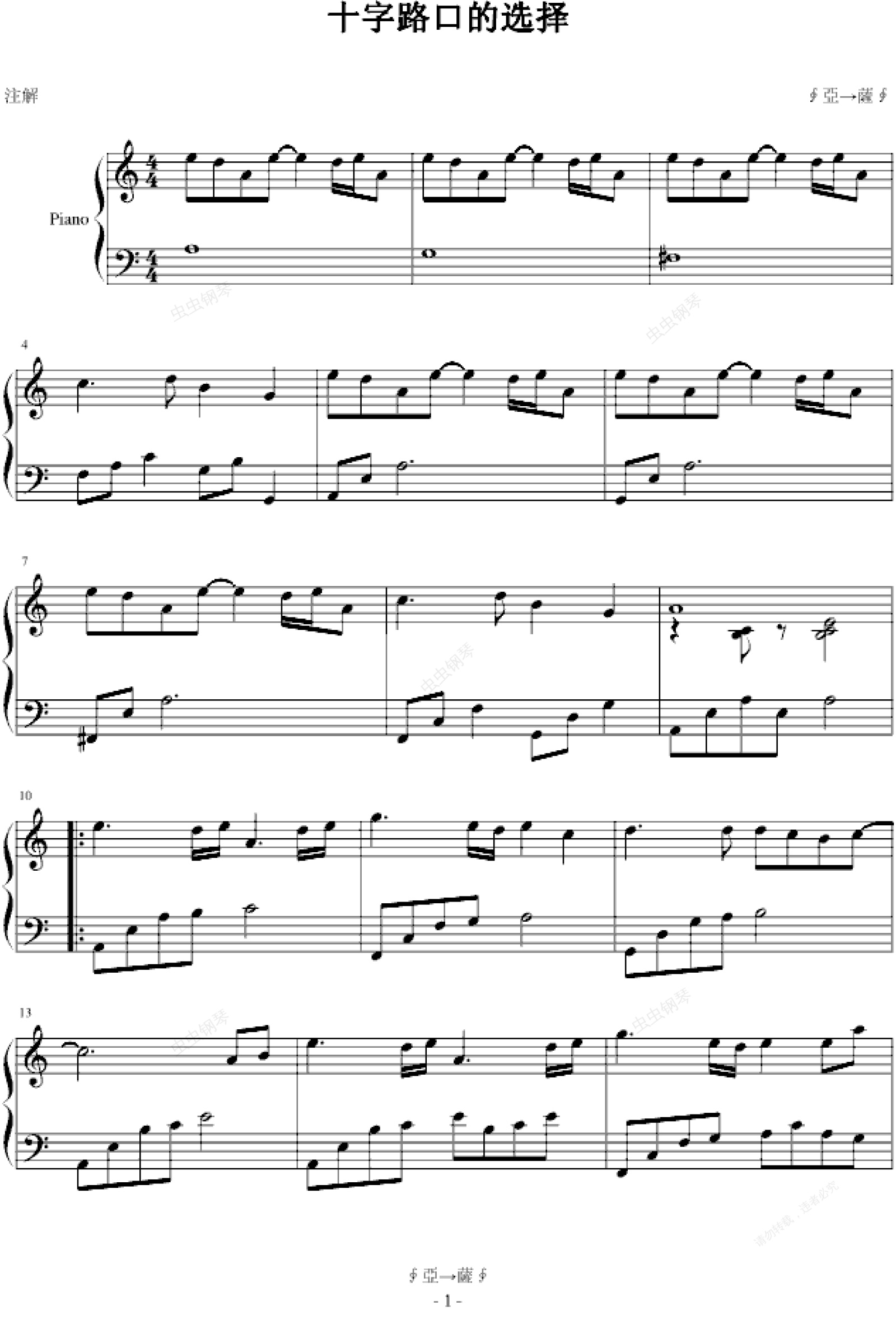 一位小兄弟让我写首曲子,命名.我感觉站在十字路口可能就是这样的旋律(个人理解).忧郁,徘徊(向前向左向右还是退后?),好象在黑暗里看不到方向,不知道该何去何从.但只要勇敢的走下去,一定又会见到曙光.所以最后以A和弦结束(开头是以Am开始),让人看到一丝希望.(信念就是你人生的最大动力,信对了,一切都是对的了)
