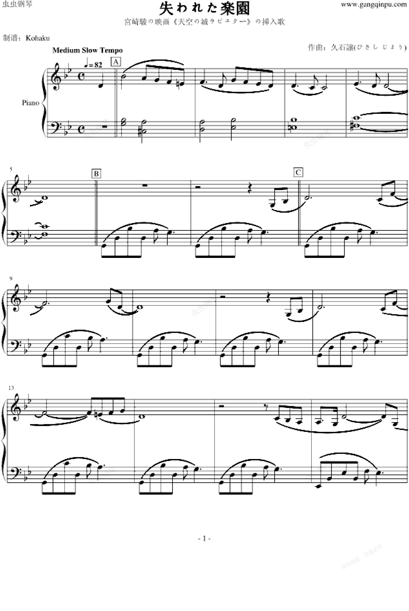 钢琴谱:天空之城-插曲-失われた楽園