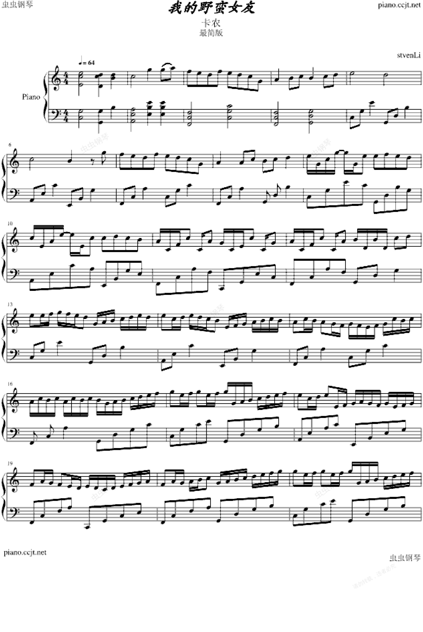 钢琴谱:卡农最简版野蛮女友