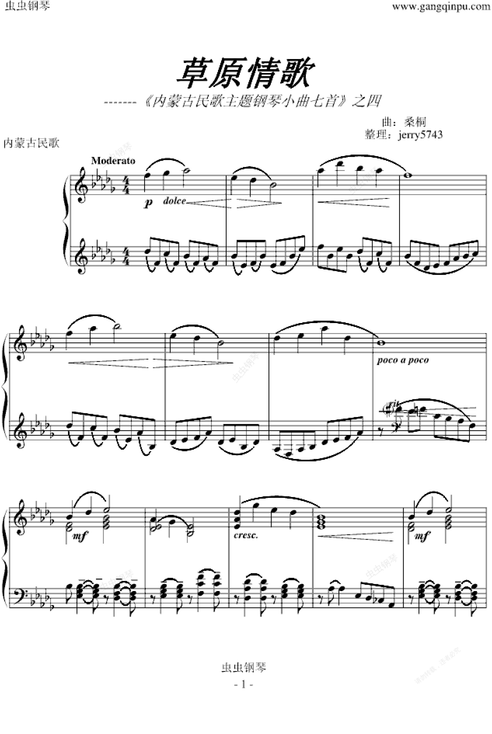 钢琴谱:草原情歌--------《内蒙古民歌主题钢琴小曲七首》之四