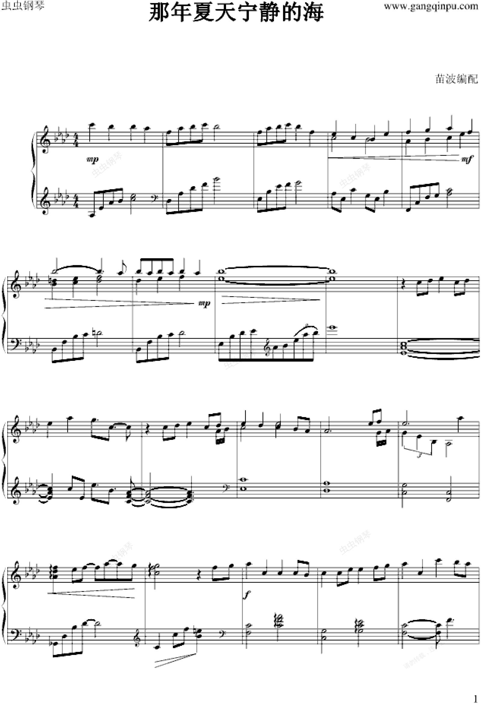 钢琴谱:那年夏天宁静的海-苗波版