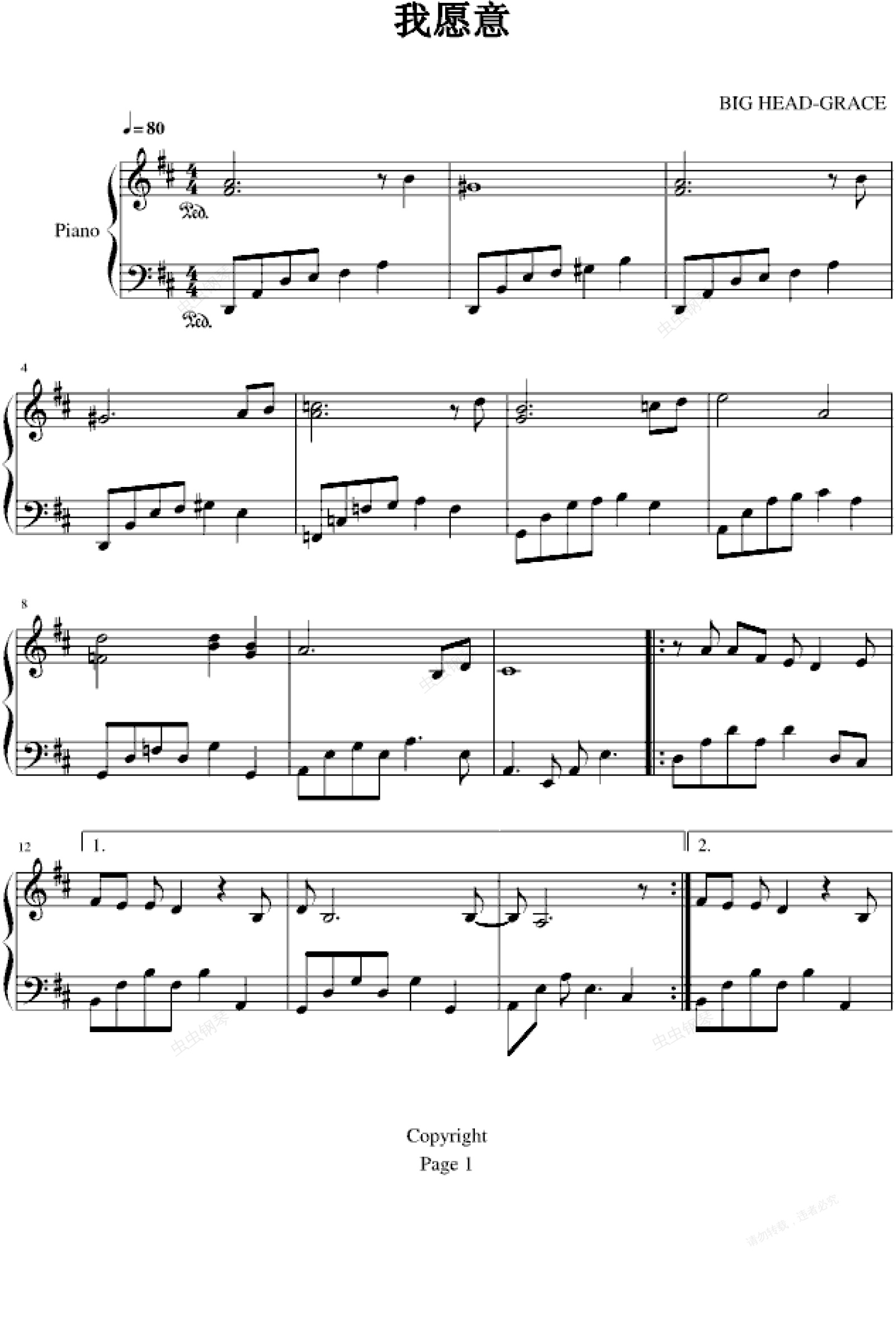 钢琴谱:我愿意-大头Grace版