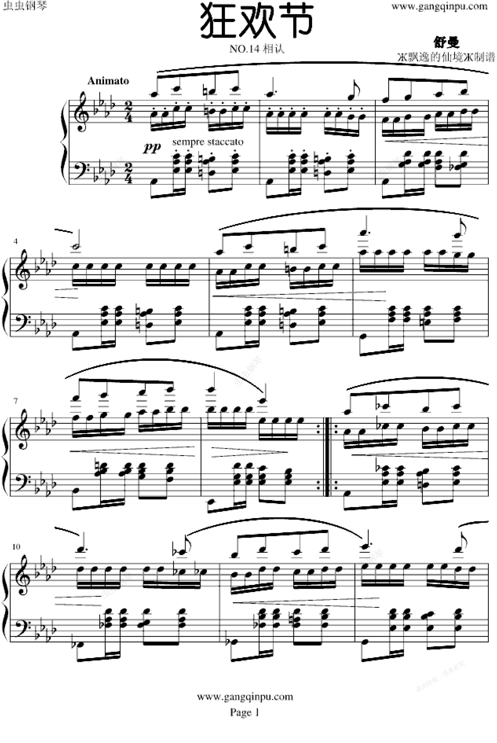 《狂欢节》,此钢琴套曲完成于1835年,这一年舒曼二十五岁。后来在1837年的一封信中,有下面一段关于这首乐曲的记事:"这一系列乐曲,似乎全部是为某一特别的目的而写的。……ASCH是波希米亚的一个小市镇的名字,在此不但有我在音乐方面的朋友,同时很有意思的是,在我的名字中也有这个字在内()。曲名是日后才附加上去的。"