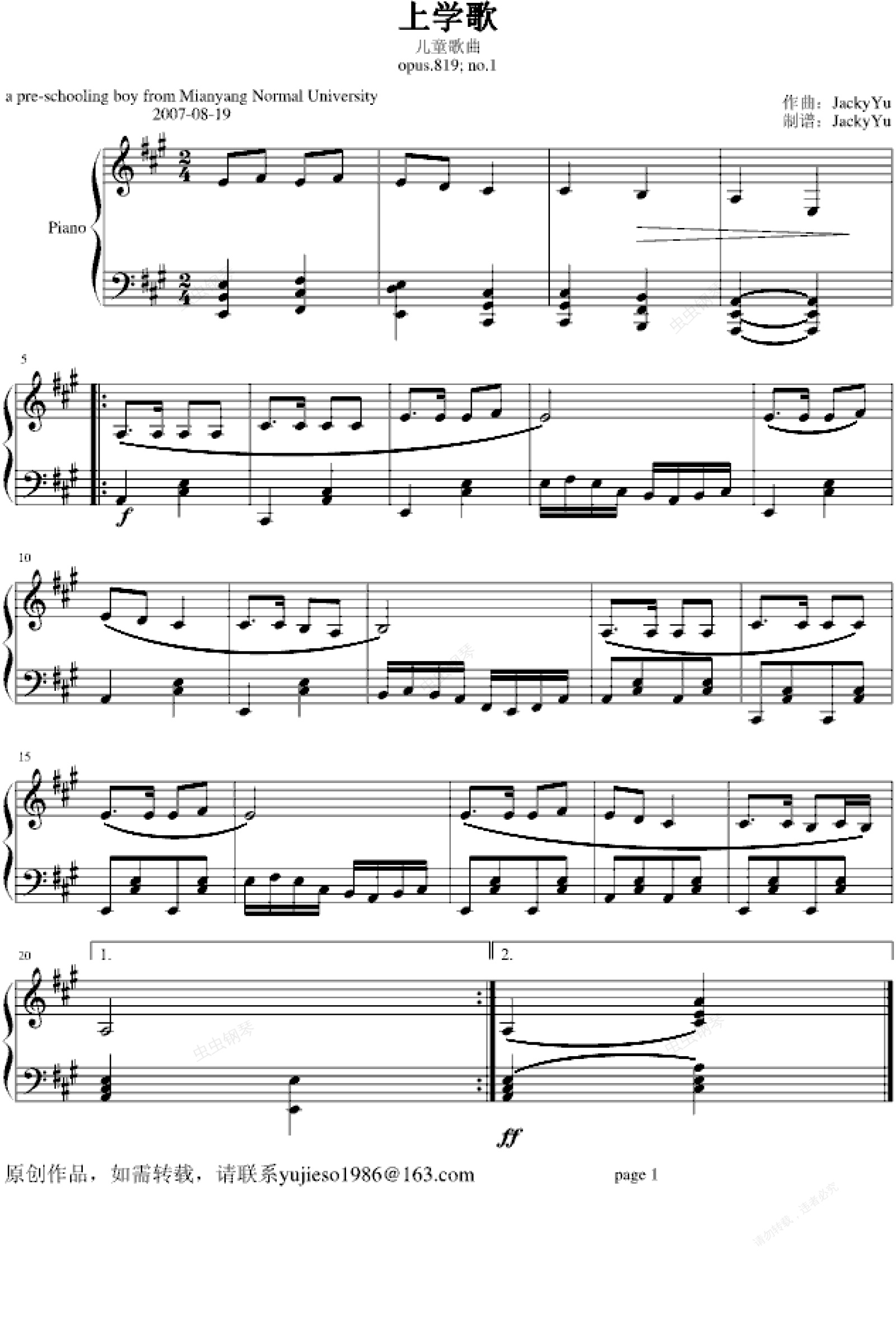 那天早上起床之后,在房间里走来走去,头脑中一直萦绕着这个旋律,让我想起我小时候早上起床之后即将去幼儿园上学时候的场景,于是我在琴上跑了一下,就把曲子的旋律写了出来,然后写了前奏和伴奏!这样的儿童歌曲应该是很简单的,我觉得很好听,有幼儿歌曲的味道,而且也很好唱,不像现在很多的幼儿歌曲,不怎么有幼儿的味道!只是没有写词,以后我有空的时候写吧!呵呵! 这是我第一次作曲,我是学学前教育的,没有专门学过作曲!