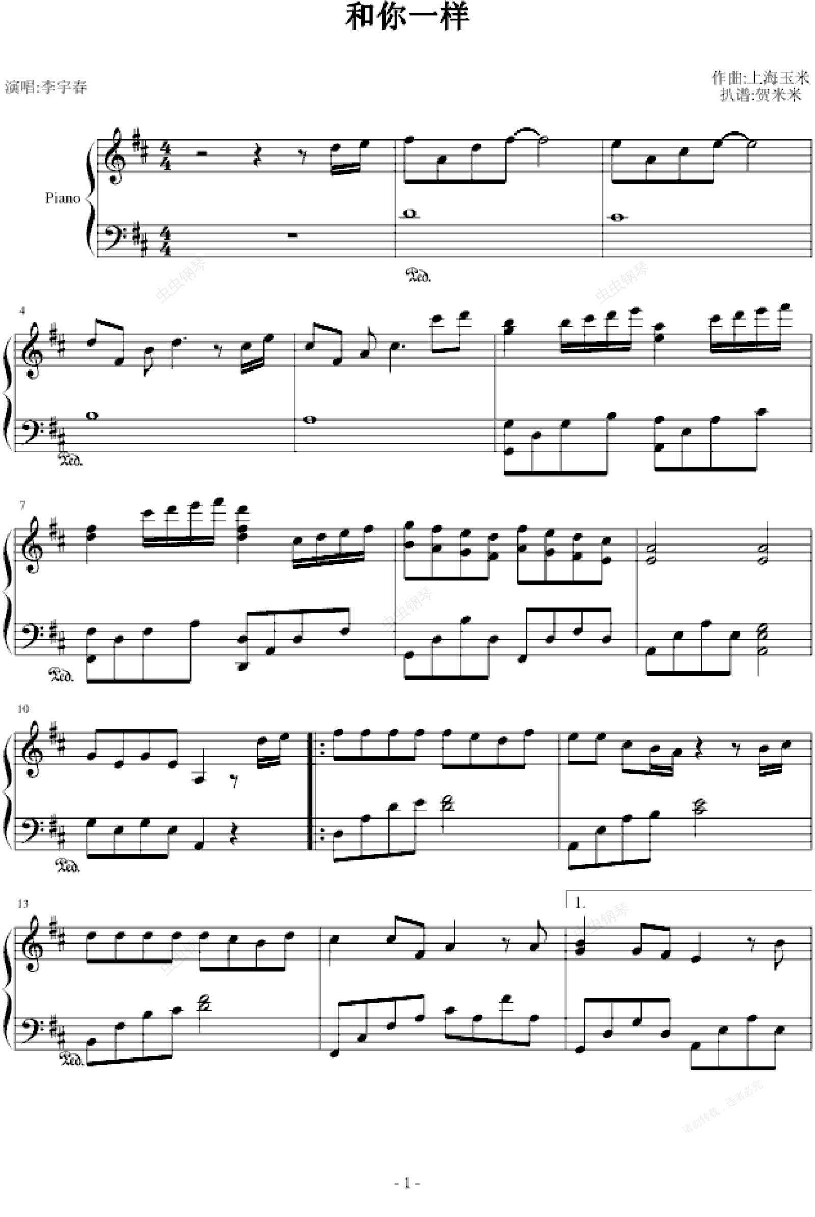 钢琴谱:和你一样