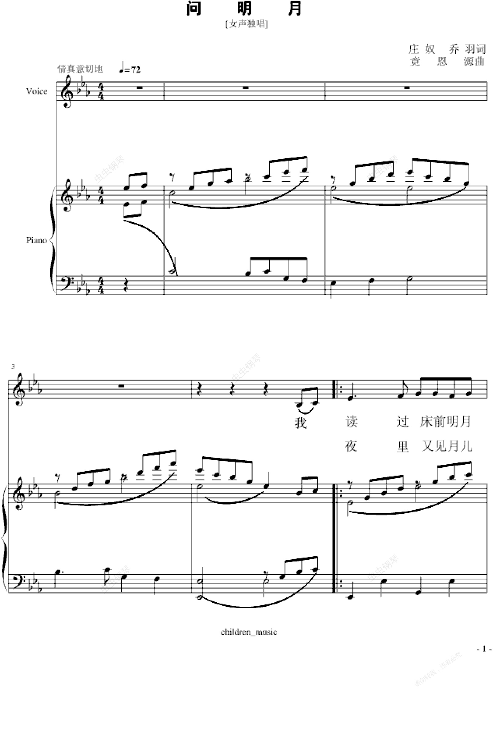 2005年8月13日,我国台湾与大陆两位词坛泰斗——庄奴与乔羽相聚北京,欢度中秋佳节之时,合作了一首歌词“望明月”。歌唱家梁雁翎朗诵,书法家米南阳挥毫,当场记录了这一盛世佳作。 吾常常吟读,感慨万千。今又逢月圆中秋,灵感偶发,旋记谱于此。借《虫虫钢琴》宝地一块,公之于众,希冀于同道之首肯。 由于本人水平所限,恐难达庄乔二老之标准(四海一家、天下一家、行云流水、自由自在、平易、自然、天籁之音);但必竟是余日积月累之心声,渴求哪位女中音歌唱家为之精雕细刻、奉献世人。 愿台海两岸早日亲人团聚、花好月圆。