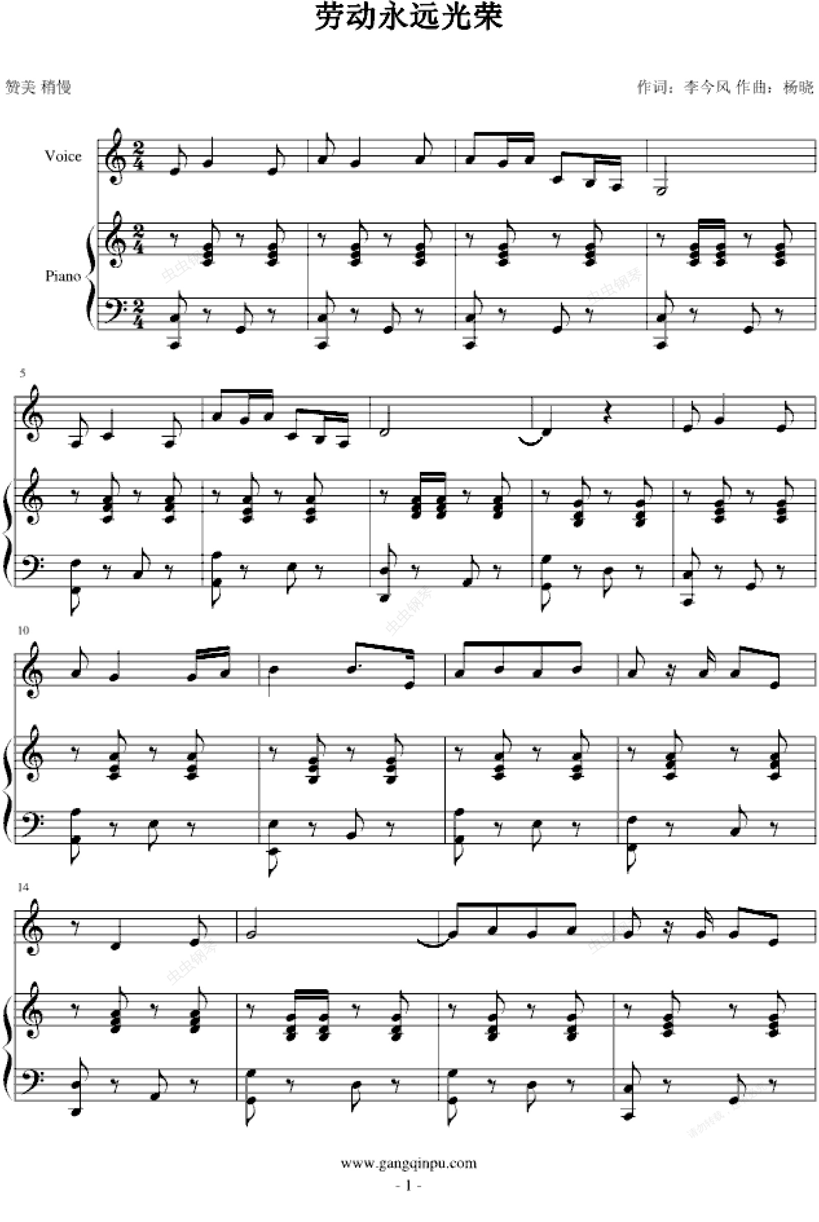 钢琴谱:劳动永远光荣
