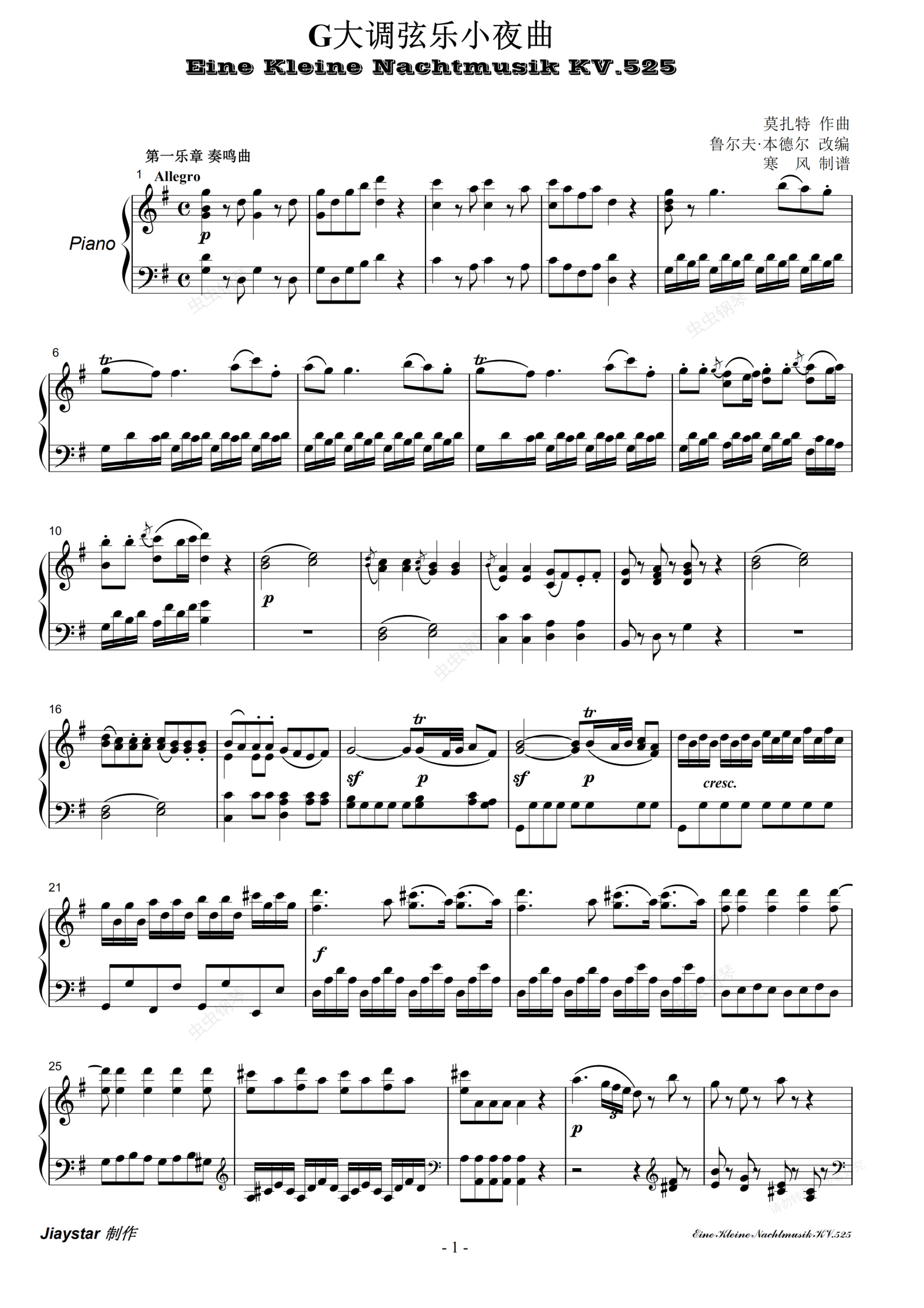 该曲是十八世纪中叶器乐小夜曲的典范,莫扎特于 1787 年8月24日 在维也纳完成,并以当时最时髦的德文用语Eine  (一首小夜曲)命名。最早为弦乐合奏,后被改编为弦乐五重奏和弦乐四重奏,尤以弦乐四重奏最为流行,是莫扎特所作十多首组曲型小夜曲中最受欢迎的一首。原有五个乐章,后第二乐章因故失传,所以现存只有四个乐章。  第一乐章,快板,G大调,4/4拍,是一首完整的小奏鸣曲。第一主题开门见山,以活泼流畅的节奏和短促华丽的八分音符颤音,组成了欢乐的旋律,其中充满了明朗的情绪色彩和青春气息;随后是轻盈的舞步般旋律。  第二乐章,行板,C大调,2/2拍,抒情的浪漫曲。 音乐开头乐队奏出简易、 动听如歌的主题,旋律温柔恬静,犹如轻舟荡漾,充满了绵绵情思。  第三乐章,小快板,G大调,3/4拍,小步舞曲。主题节奏鲜明,旋律流畅,充满了青春的活力。  第四乐章,回旋曲,G大调,快板,4/4拍,主题是一首威尼斯流行歌曲,旋律明澈流丽,跳荡着无忧无虑的情感,象征着幸福完美的爱情 。 它在该乐章中共出现五次,每次都作了调性变化。最后仍重复这一主题,结束全曲。2020.02.13修复试听。