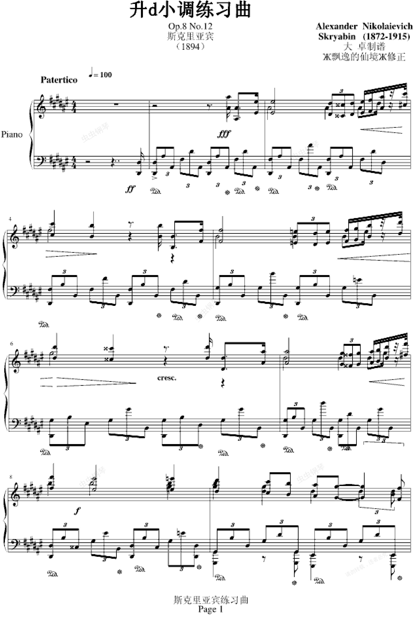 斯克里亚宾的练习曲完全是延续了肖邦和李斯特的曲子,与其不同的是,难度更为艰深,练李斯特都有点“望尘莫及”。他的谱子看着极易,却融入了巨大的感情,以及更为华丽而朴实的技巧。这是首八度、三对四、不规则、大跨于一身的练习曲,看着挺不错,光那几个升号就够难度的了。大气、恢弘是这第13首练习曲的代名词。作品8,编号12,让无数崇拜斯克里亚宾的人神往!