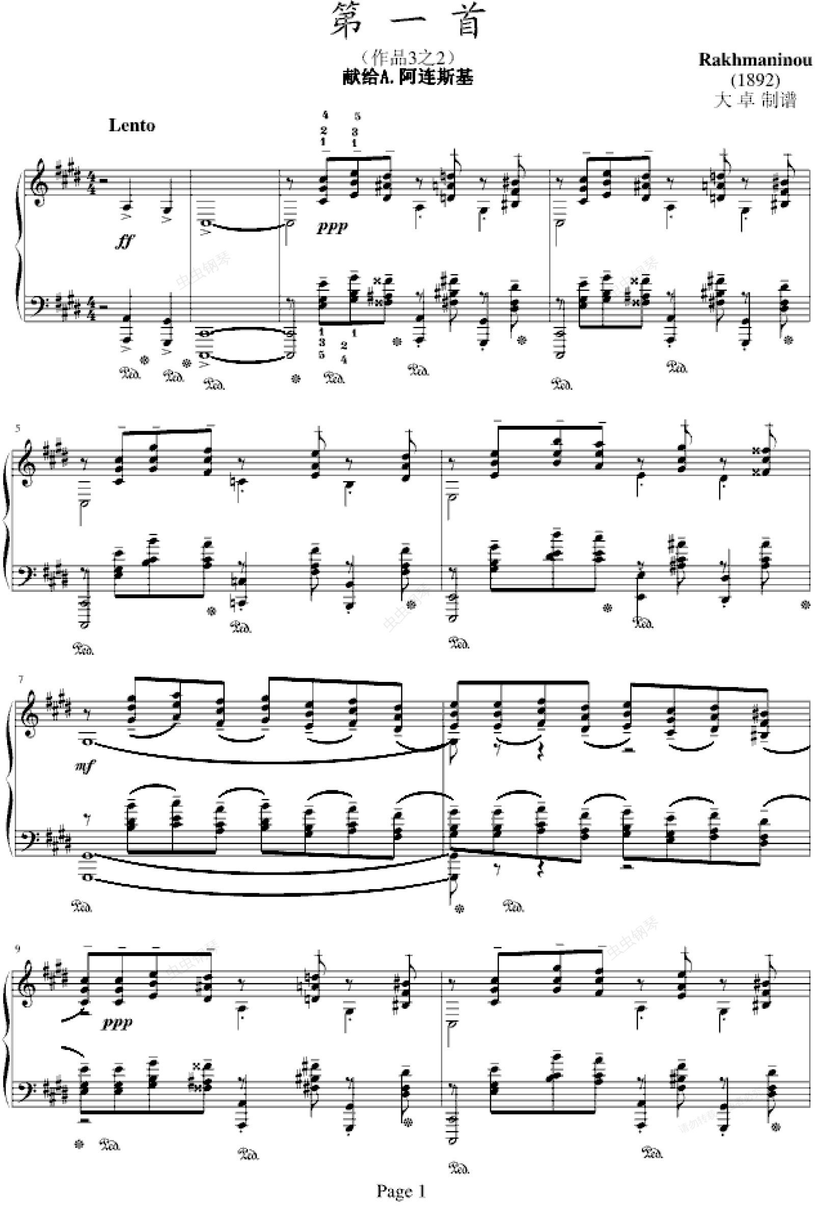 这是我最喜欢的一首前奏曲。Op.3 No.2这是拉赫玛尼诺夫24首前奏曲中的第一首也是最著名的一首。它是一首感心动耳、一鸣惊人的成名之作,后来成为拉赫玛尼诺夫在每次钢琴演奏会上必须重复演奏()的名曲(其实拉本人不是很想每次都演奏此曲,而是观众强烈要求)。它表现的是俄国知识分子在沙皇亚历山大三世黑暗统治下,痛苦压抑和悲愤激动的情绪。三个沉重的低音贯穿第一部分和再现部,中部是快板,悲愤激动的热情象汹涌的怒涛一样爆发出来。