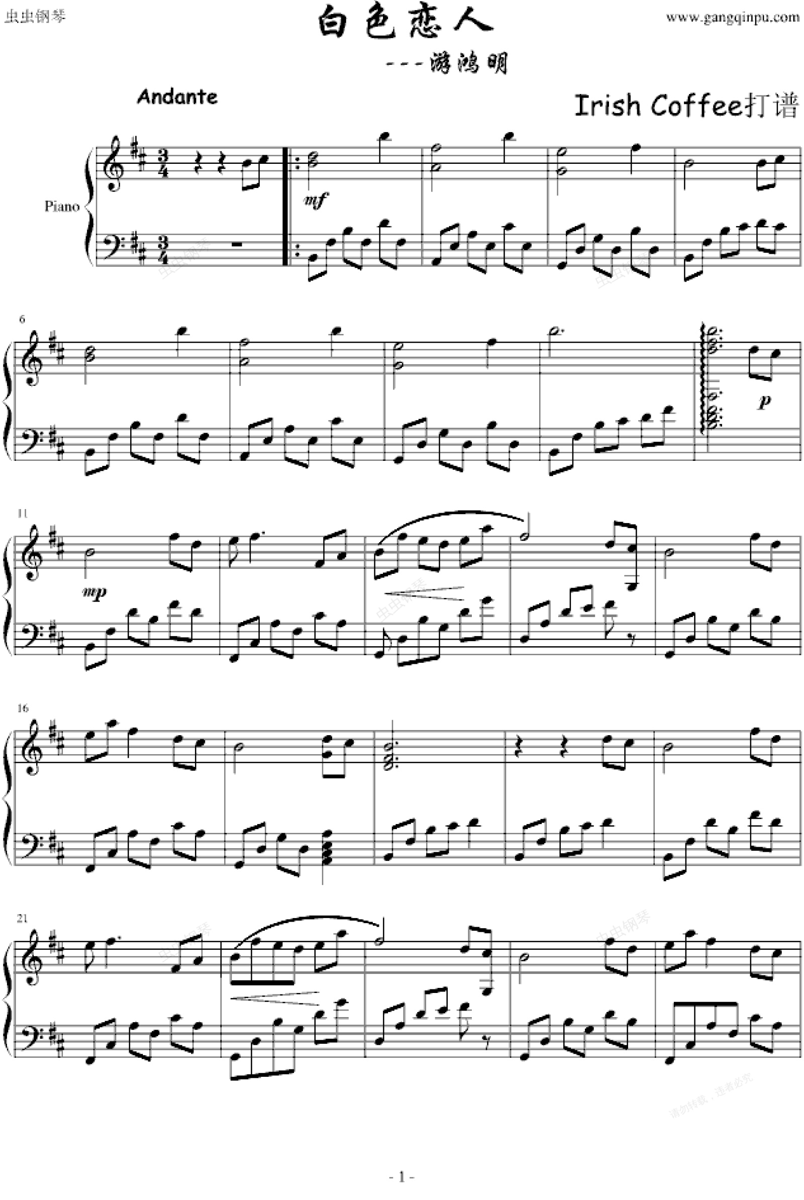 钢琴谱:白色恋人--游鸿明
