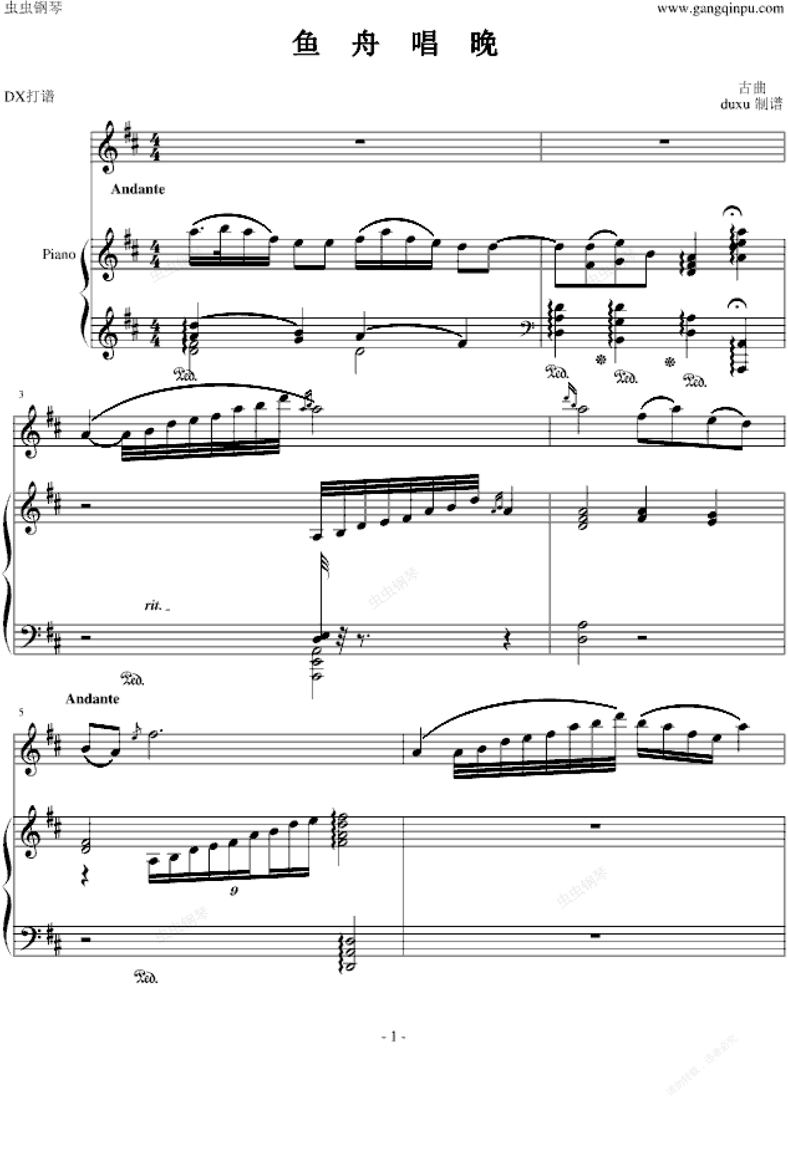 钢琴谱:渔舟唱晚-笛+钢琴