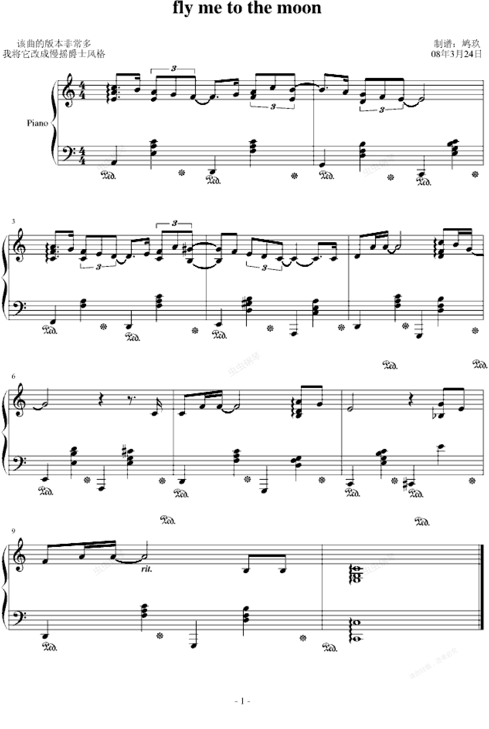 Fly me to the moon 由巴特.霍华德(bart )写于1954年,是首华尔兹舞曲,也是他最有名的一首作品。最初由当时他工作的酒店的驻店歌手 演唱。随后一位出版商建议将其改名为Take Me to the Moon,巴特.霍华德采纳了他的意见,并最后将这首歌定名为我们今天看到的Fly Me to the Moon.然后由佩姬.李(peggy lee)1960年演唱的版本成名。所以我们在很多地方也可以看到这首歌被写成Fly Me to the Moon(In Other Words)。随后这首歌被多丽丝.黛、朱迪.贾兰等好莱坞女星演唱,而弗兰克.辛纳塔(frank )的翻唱更是让这首歌的名声达到了一个无法形容的地步。美国宇航局曾把他演唱的这首歌的唱片,通过阿波罗飞船送上月球,使得Fly Me to the Moon成为第一首在月球上播放的人类歌曲。在里,我们可以大致看到这个歌的一个不完全翻唱列表。写了这首歌以后,基本上巴特?霍华德老爷子也就再没有什么事情好做了,这首歌给他带来了巨大的收入,按照AMG的说法就是他顺利进入了半退休的状态。并且最后在1999年还被列入了音乐创作名人堂。90年代的时候老爷子还说,如果当时他没有决定把歌名改为Fly me to the moon&apos,他不知道现在会过着什么样的生活。