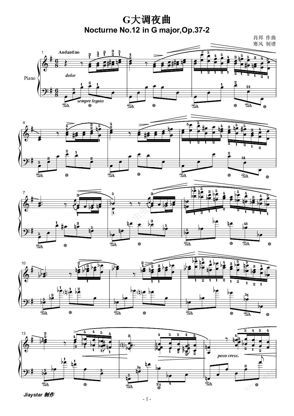钢琴谱:肖邦夜曲12-G大调夜曲(OP.37-2)