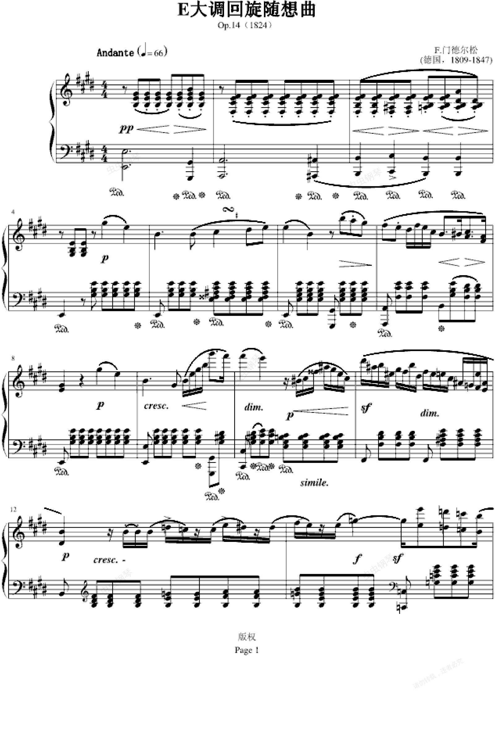 这是一首规模庞大的曲子,门德尔松的。Op.14这首是《随想回旋曲》Rondo  Op.14是门德尔松最闻名的的钢琴曲之一,在音乐会上是很常见到的。乐曲包括随想曲和回旋曲两部分,随想曲部分为E大调,回旋曲部分为e小调,具有浪漫派的音乐风格。好似一位天生丽质的少女,典雅、美丽、风姿卓越,楚楚动人。